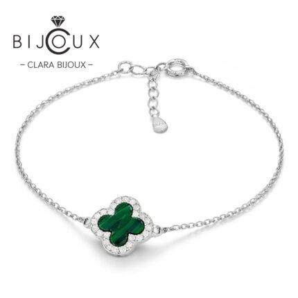 Сребърна гривна с детелинка от малахит и бели камъни Clara Bijoux