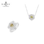Този изящен комплект, включващ колие и пръстен, изработени от родирано сребро във формата на сърце включващи зашеметяващи лабораторно създадени Цитрини в центъра си, заобиколени от ореол от искрящи Бели Циркони. Верижката е включена в цената. Всички бижута са придружени от специален сертификат, удостоверяващ автентичността им. На този сертификат можем да изпишем и лично послание за Вас или за когото е бижуто. Всяка поръчка пристига при Вас луксозно опакована, в брандирана кутийка и торбичка, готова за поднасяне като подарък.