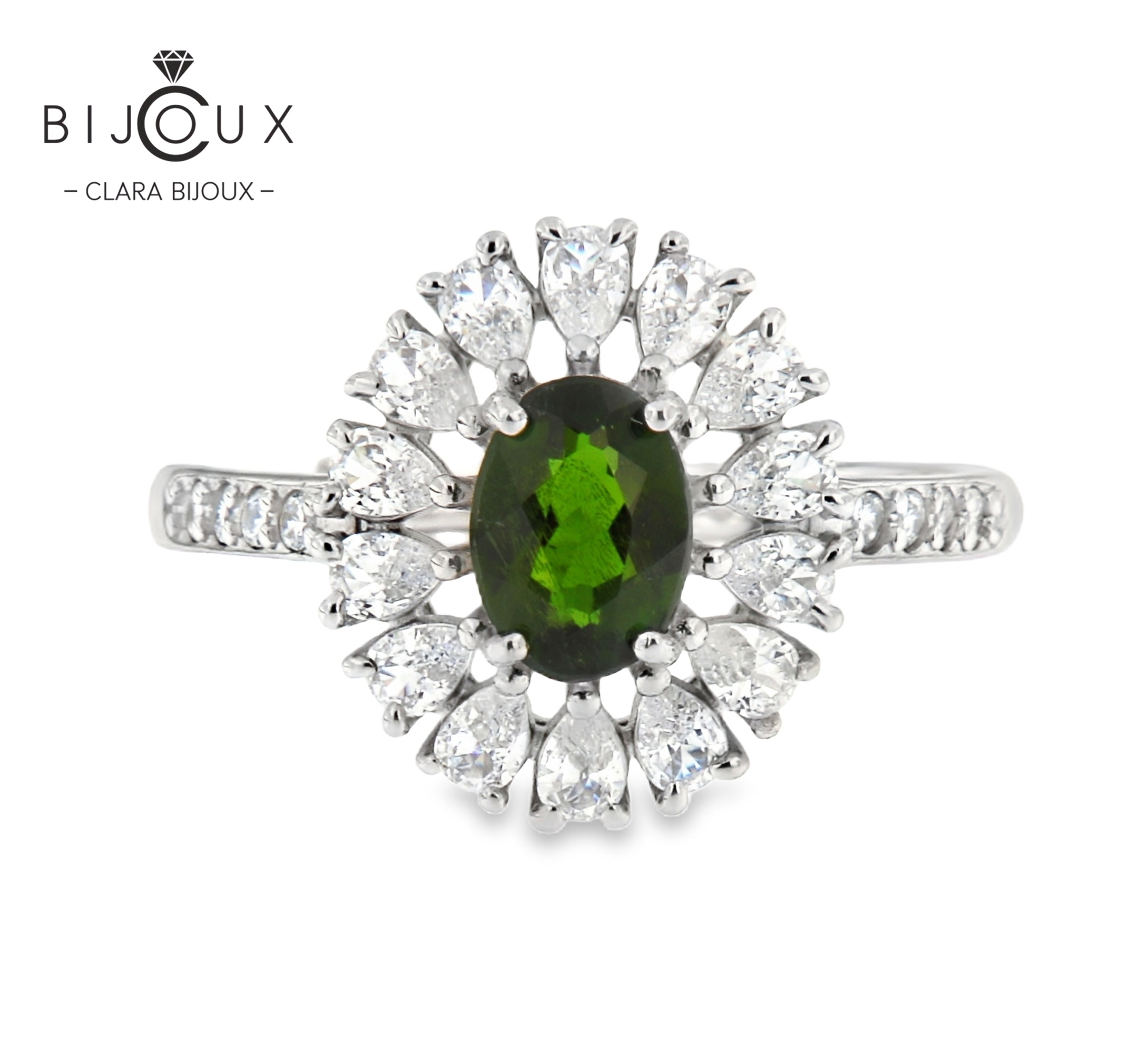 Изящен сребърен пръстен от проба 925 с родиево покритие, инкрустиран с естествен Диопсид 1.0 ct, обграден от бляскави бели CZ камъни. Пръстенът впечатлява с луксозния си вид и се предлага в елегантна LED кутия с подаръчна торбичка. Регулируем размер и топ качество на изработка от Clara Bijoux.
