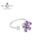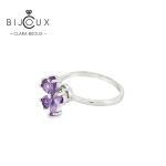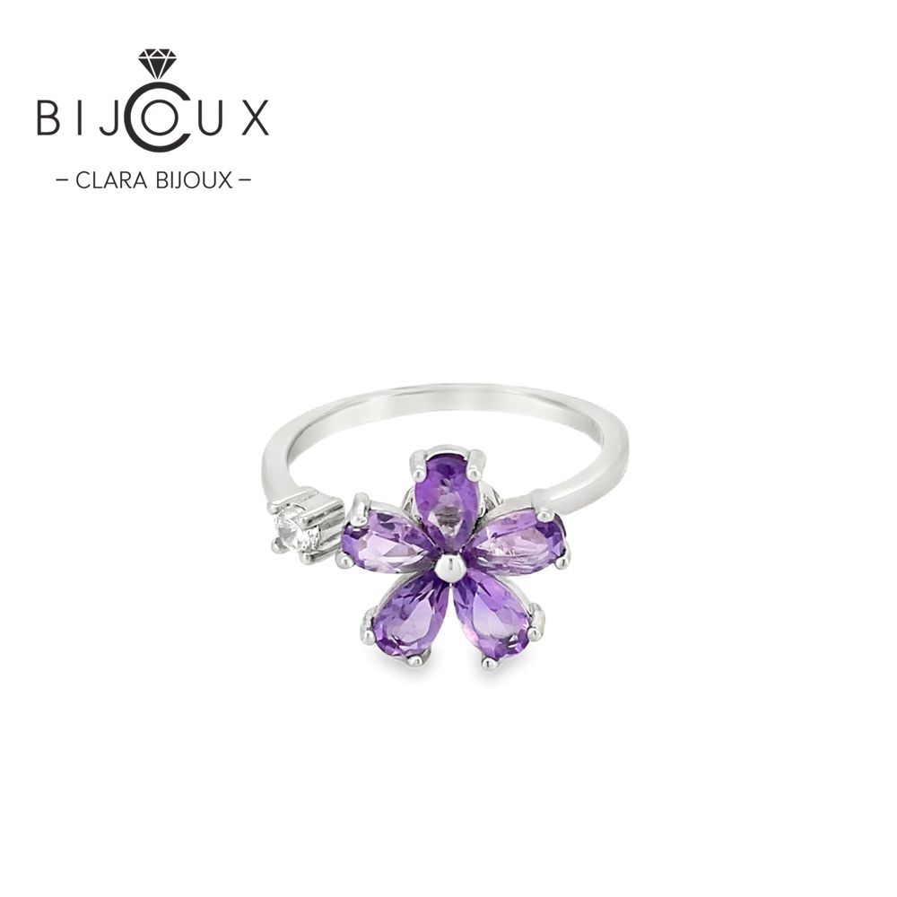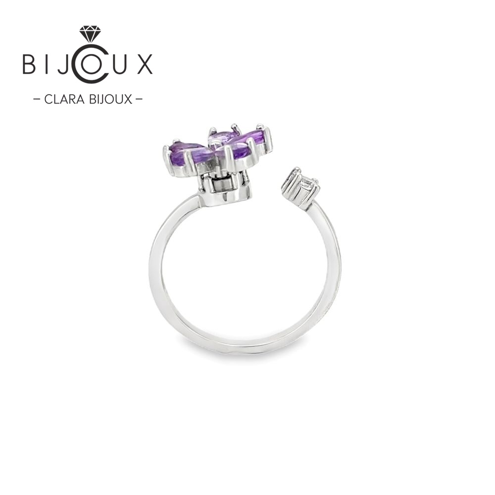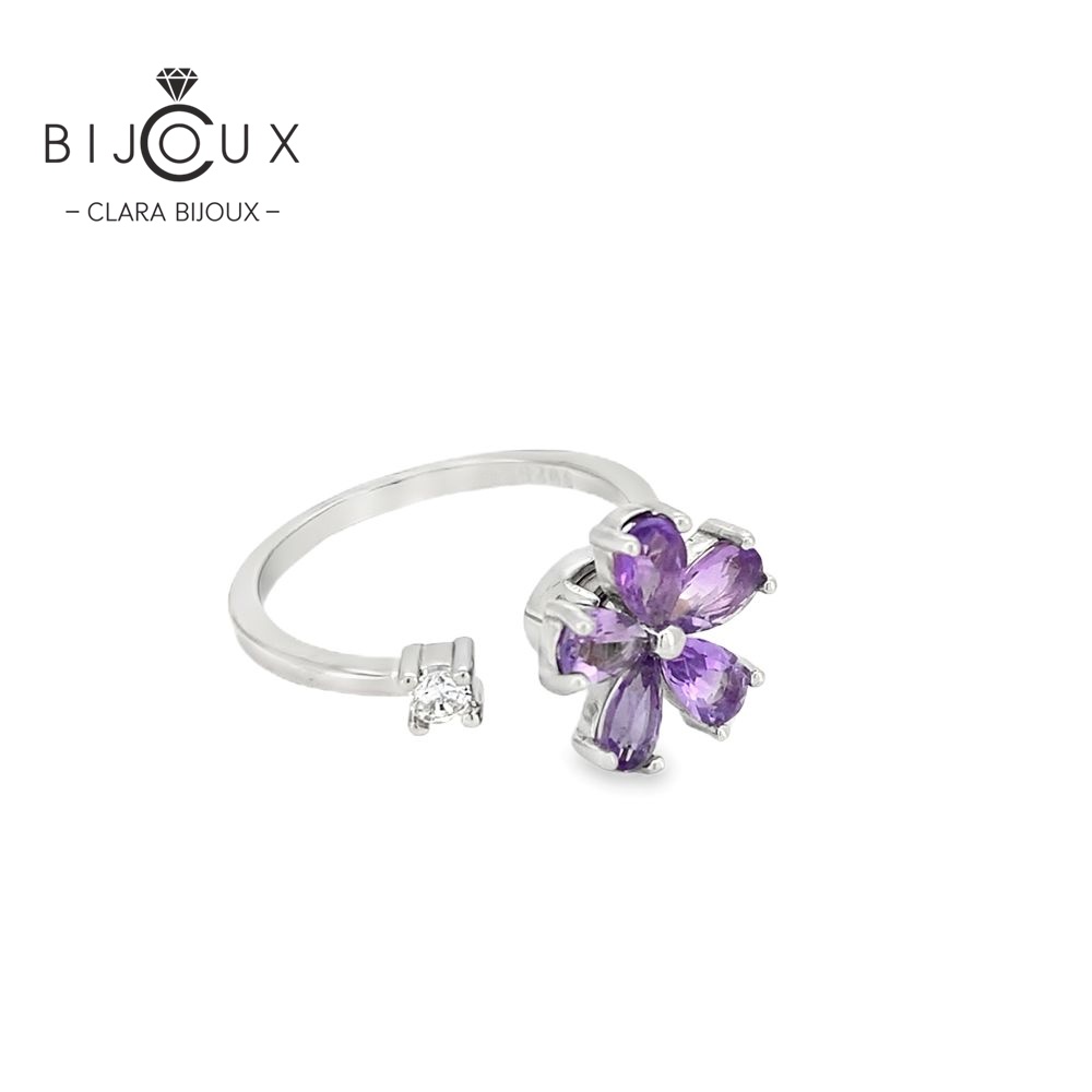 Бутиков сребърен пръстен с флорален силует Clara Bijoux, вдъхновен от нежната форма на цвете и изработен с внимание към всеки детайл. Моделът е с родиево покритие, естествен аметист и бели CZ камъни, с регулируем размер – елегантно бижу с топ качество, луксозно опаковане и изразен бутиков стил на топ цена.