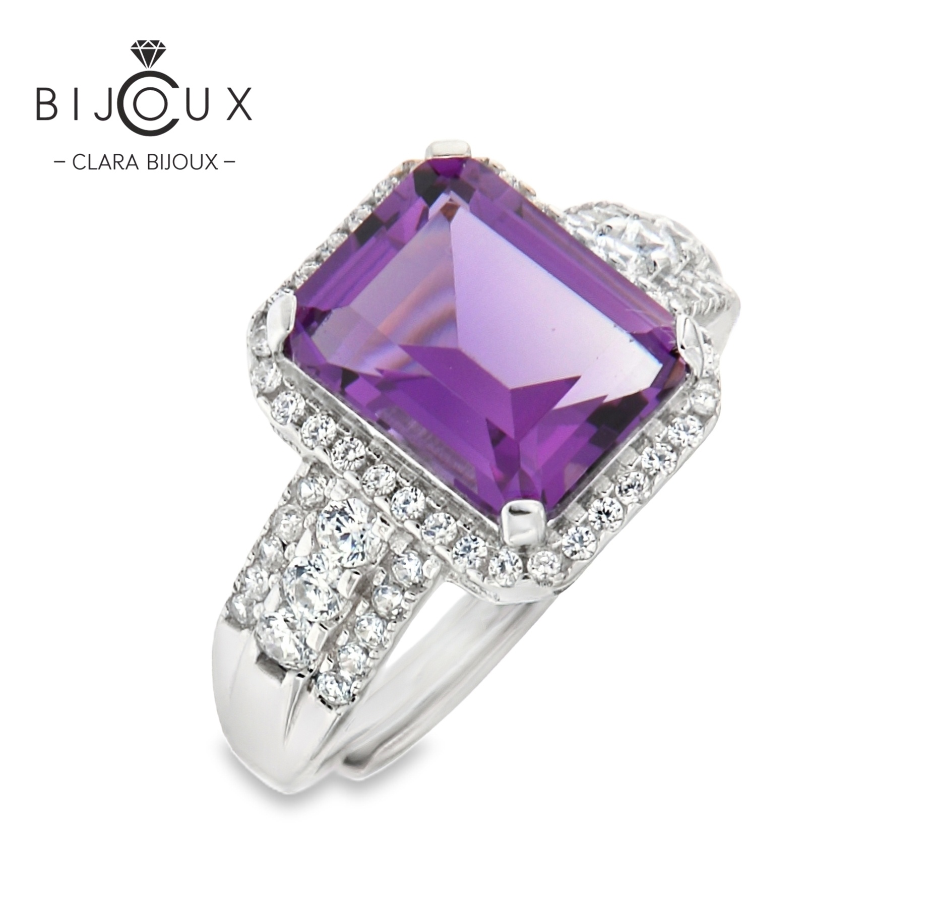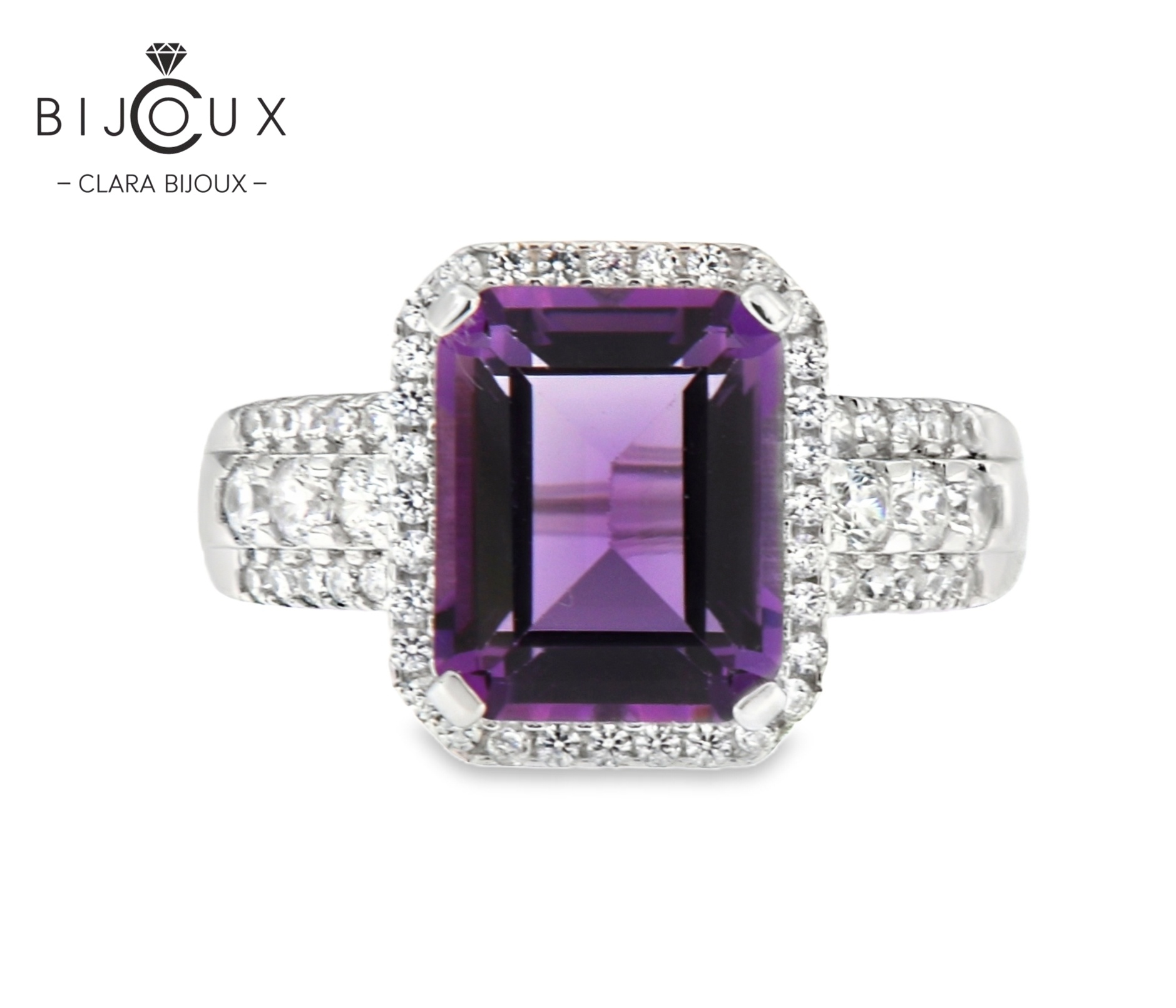 Този бутиков сребърен пръстен с естествен Аметист Clara Bijoux впечатлява с изключителна комбинация от модерна геометрия и класическа елегантност. Централният камък – естествен аметист 3.2 карата, е шлифован в изумруден правоъгълен разрез, който подчертава дълбочината на виолетовия му цвят.