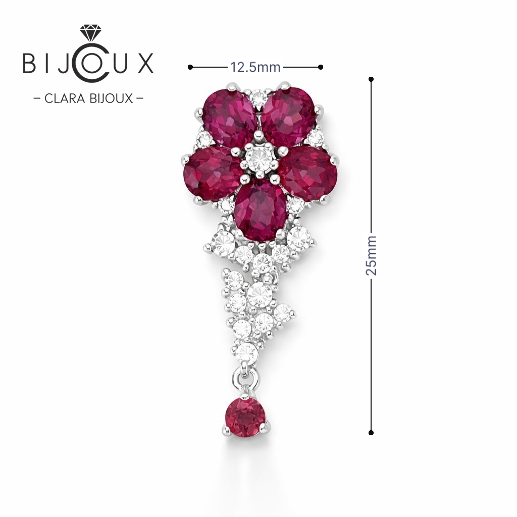 Тази дизайнерска сребърна висулка с естествен гранат 2.3 ct Clara Bijoux впечатлява със своята изящна флорална форма и изразен бутиков характер. Естествените гранати са подредени във форма на цвете, като наситеният им рубиненочервен цвят създава силен визуален акцент и усещане за дълбочина и благородство. Белите CZ камъни оформят сияйна композиция, която добавя баланс и фин блясък към дизайна.