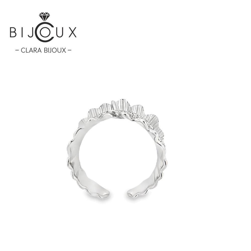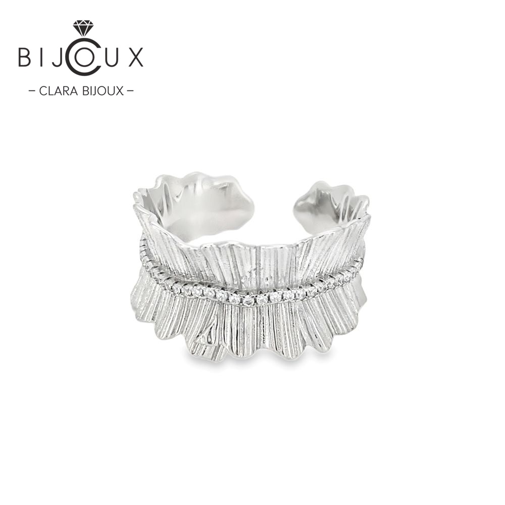 Дизайнерски сребърен пръстен Clara Bijoux с отличителен релефен дизайн и фини бели CZ камъни. Моделът е с родиево покритие, регулируем размер и грамаж 4.7 г – израз на артистичен стил, топ качество и луксозно опаковане на топ цена.