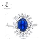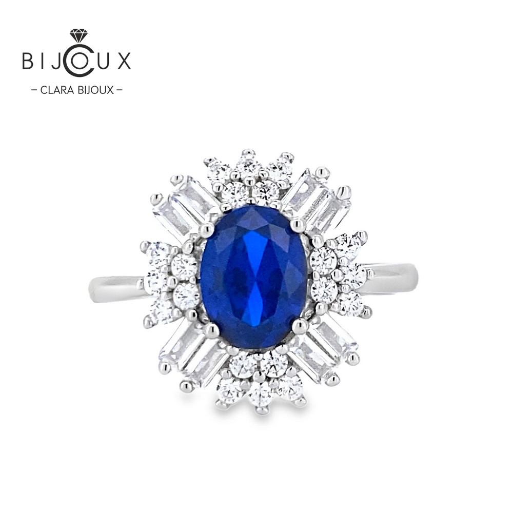 Този изискан дамски пръстен е въплъщение на лукс и елегантност. Изработен от фино родирано сребро, той е украсен със зашеметяващ овален кралски син сапфир, обграден от изискани циркони с багет и кръгла форма, които подчертават красотата и блясъка на камъка.