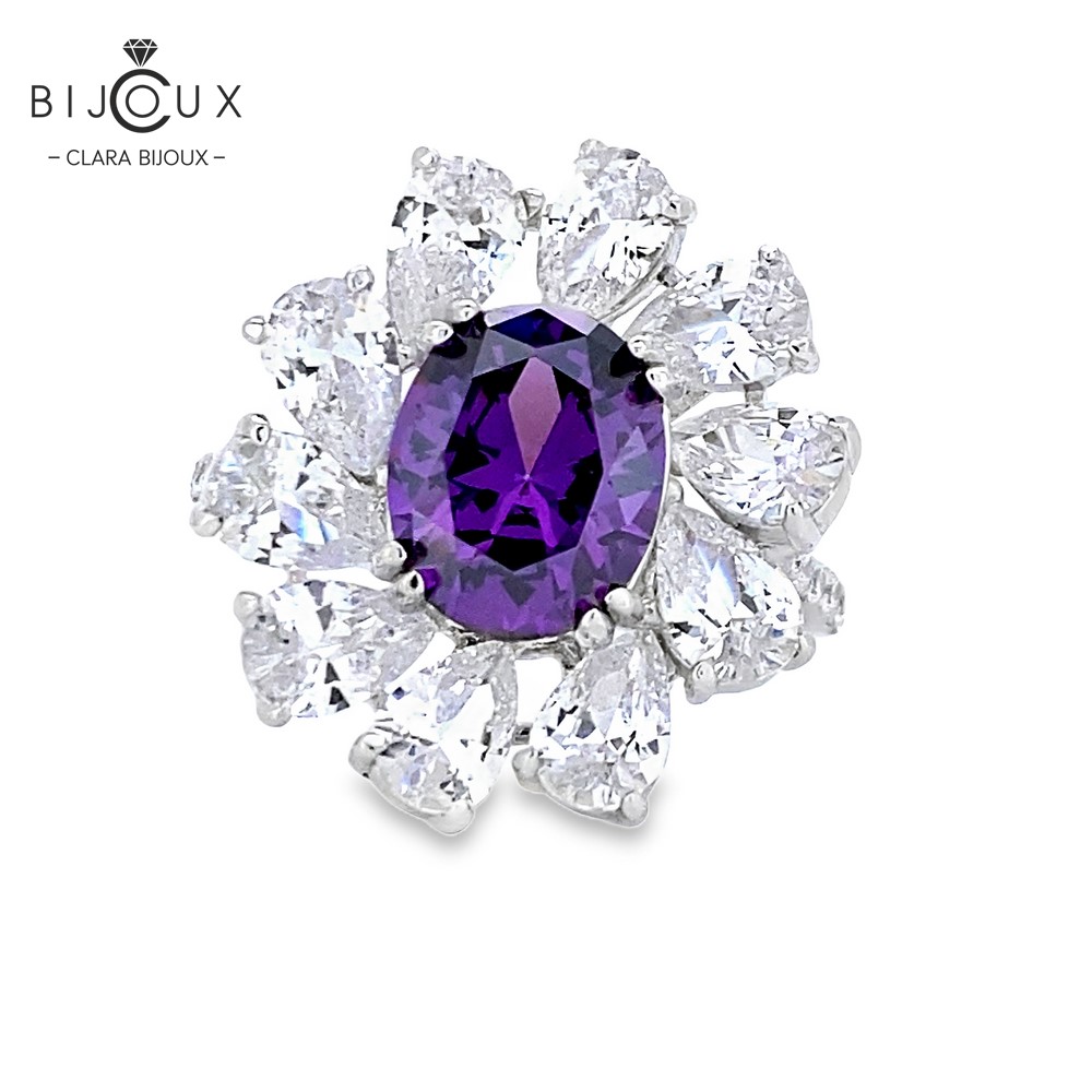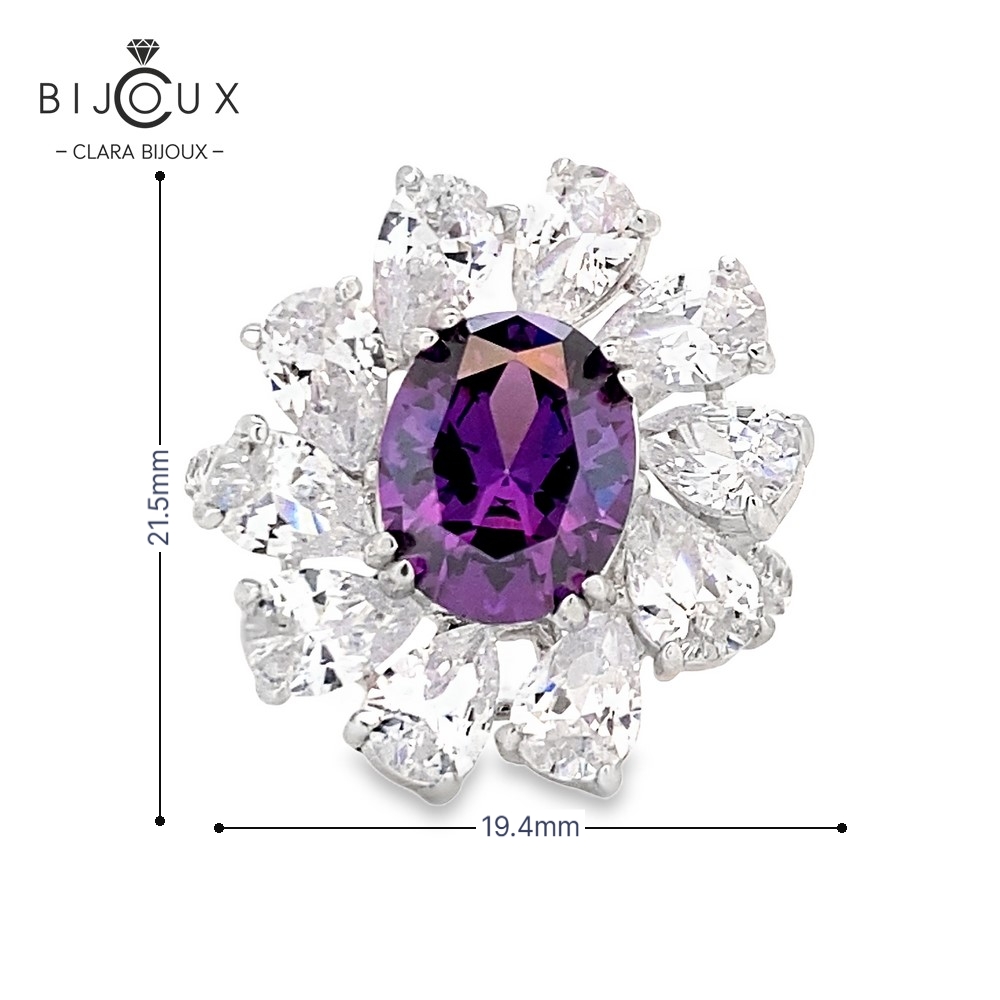 Представяме ви сребърен пръстен с аметист – модел CHR115 от Clara Bijoux – истинско бижу за почитателките на елегантността. В центъра се откроява голям, лабораторно създаден аметист в наситен виолетов нюанс. Камъкът е обграден от прецизно подредени циркони, които създават сияен ореол и придават блясък от всички ъгли.