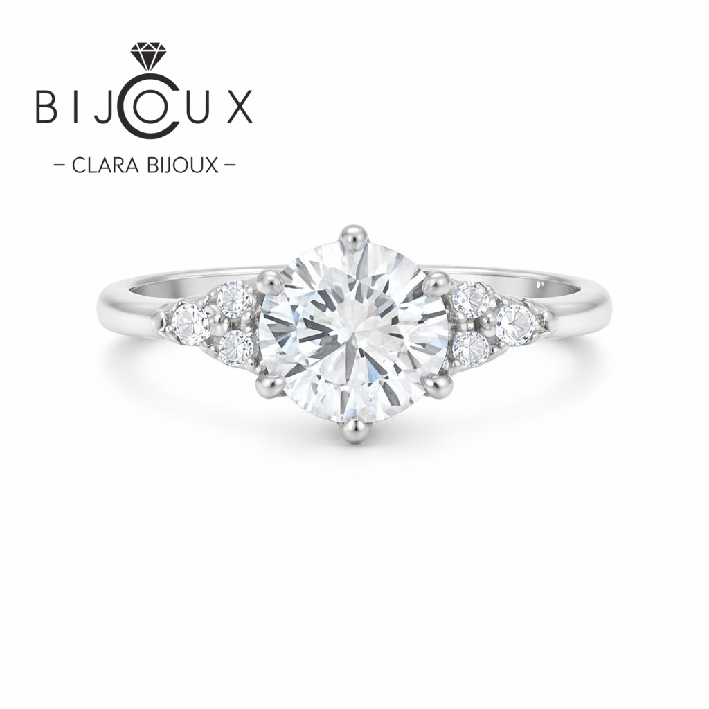 Централният камък – блестящ кръгъл циркон – е внимателно закрепен с шест изящни нокътя, които позволяват на светлината да прониква от всички ъгли. От двете страни са инкрустирани допълнителни по-малки камъни, които добавят допълнителен блясък и изисканост. Цялостната визия е женствена, елегантна и напълно подходяща за годеж, годишнина или друг специален повод.