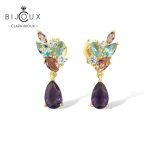 Обеците са изработени от сребро проба 925 и са завършени с жълта позлатка, която придава топъл, луксозен нюанс и допълва цветните камъни. В дизайна са използвани сини и лилави кристали, комбинирани с бели CZ за допълнителен блясък и баланс. Всеки камък е прецизно инкрустиран, което гарантира устойчивост, дълготрайност и топ качество.