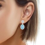 Елегантни сребърни обеци 925 с родиево покритие и искрящи Swiss Blue Topaz 1.9ct, обградени от бели CZ камъни. Модел с изискан луксозен характер, подходящ както за ежедневие, така и за специални поводи. Включена луксозна LED кутия и подаръчна торбичка.