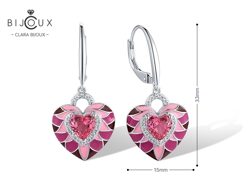 Емайлираните обеци Clara Bijoux са създадени, за да вдъхновяват и впечатляват. Изработени от висококачествено сребро 925 с родиево покритие, те съчетават устойчивост и изящество в едно. Дизайнът представя сърце, богато украсено с ръчно нанесен емайл в нюанси на розово и бордо, което обгръща централния розов кристал с форма на сърце. Белите камъни CZ около него придават фин завършек и сияние.