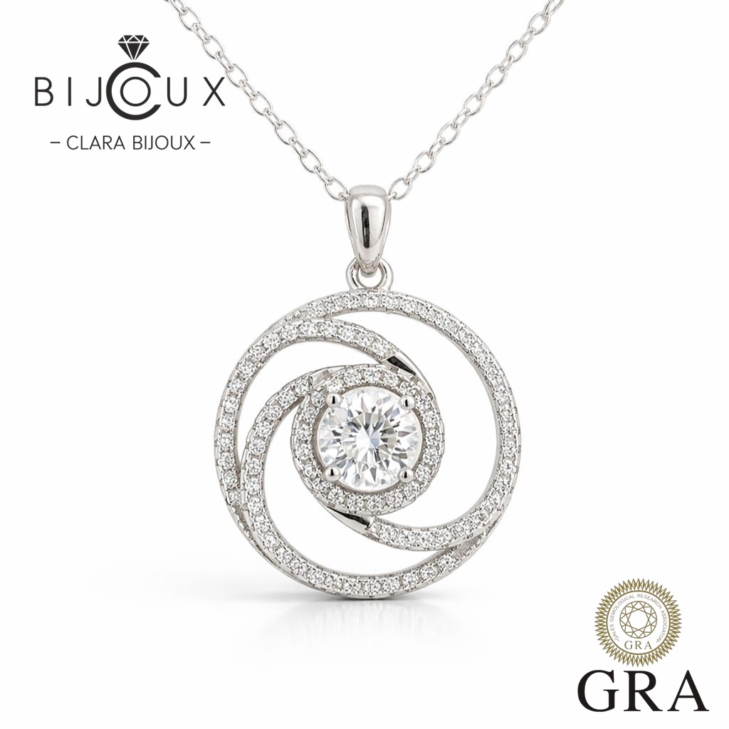 Това стилно колие с мойсанит и преплитащ се ореол от Clara Bijoux е олицетворение на съвременната елегантност. Впечатляващият дизайн съчетава централен камък мойсанит с брилянтен шлиф (1.0ct, 6.5 мм), цвят D и чистота VVS1, обграден от преплитащ се Halo обков от фини бели мойсанити. Резултатът е бижу, което улавя светлината от всеки ъгъл и излъчва енергия, стил и движение.