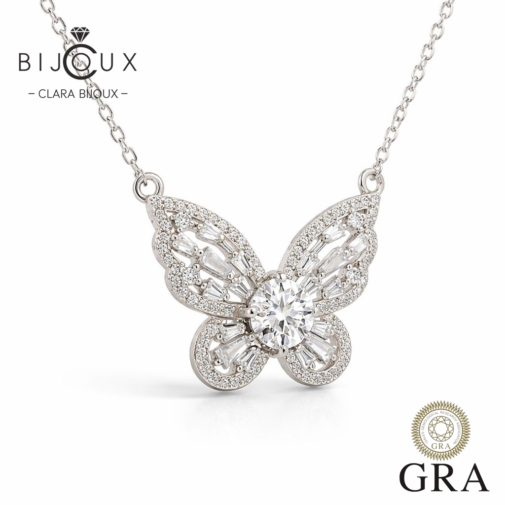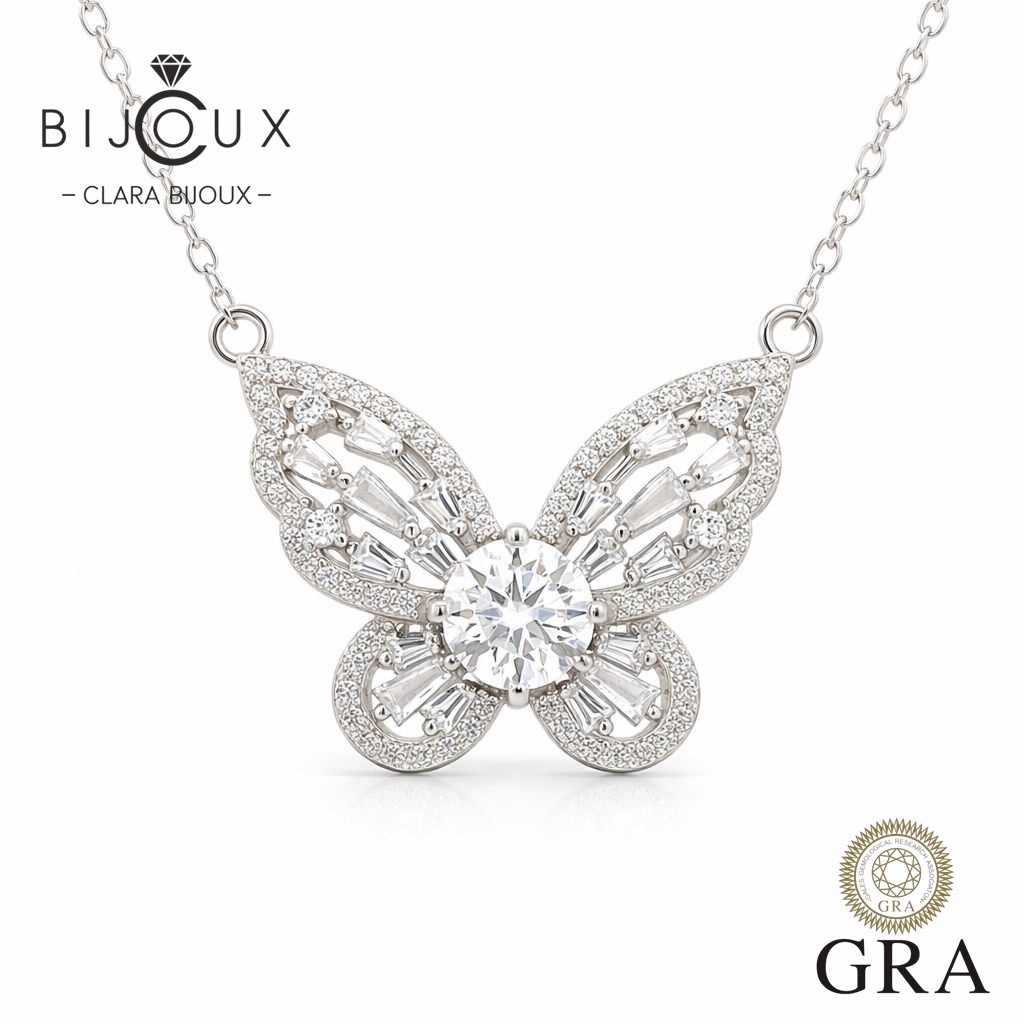 Това сребърно колие с форма на пеперуда е украсено с централен мойсанит 1.0ct и обгръщащи го фини малки камъни – всички със сертификат GRA 📜 Изящният дизайн носи усещане за свобода, женственост и нежност. Перфектен избор за романтичен подарък или за дама, която обича фини бижута с послание ✨