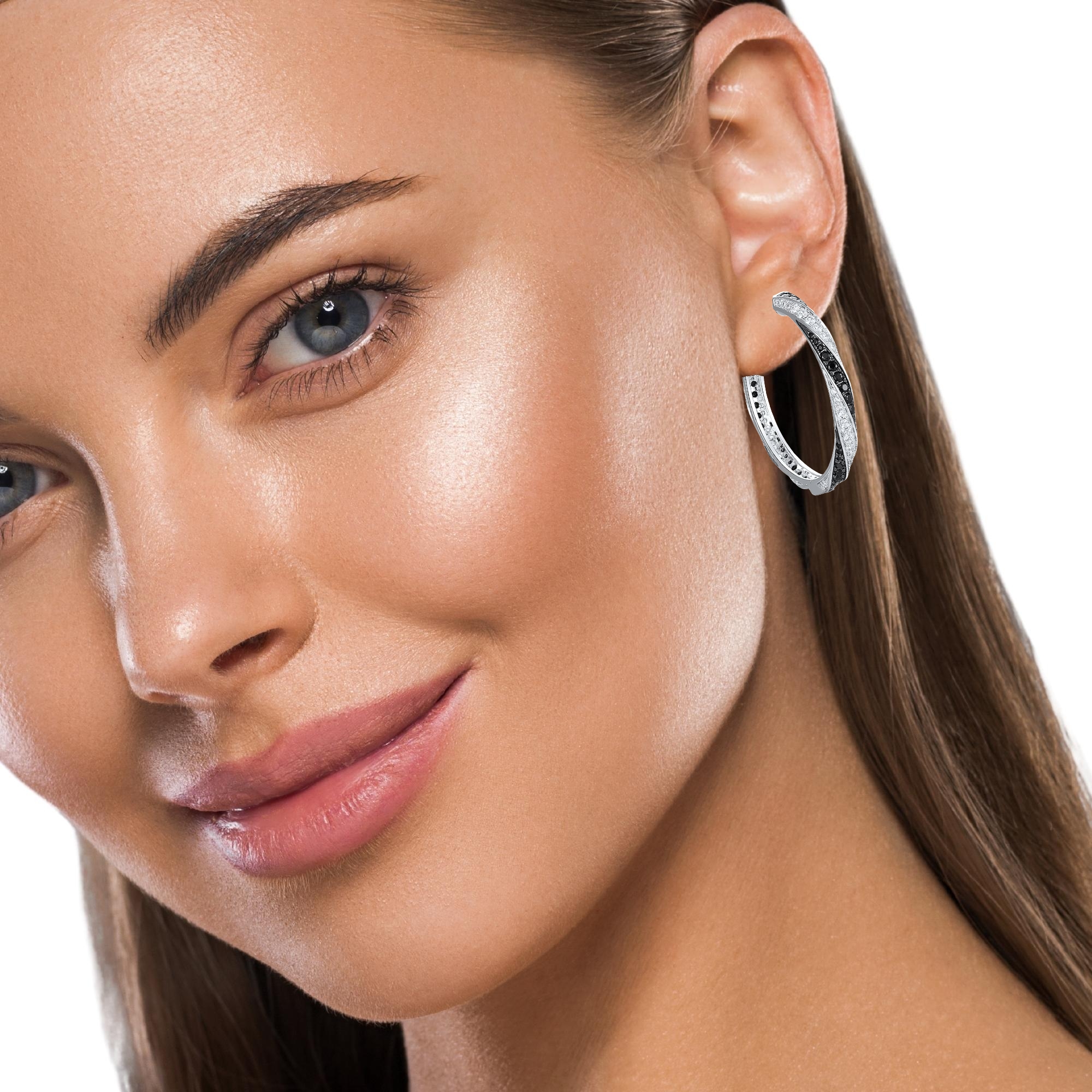 Стилни кръгли обеци „Черно и бяло“ от сребро 925 с родиево покритие, украсени с черни шпинели и бели CZ камъни. Съвършен баланс между класика и модерност.