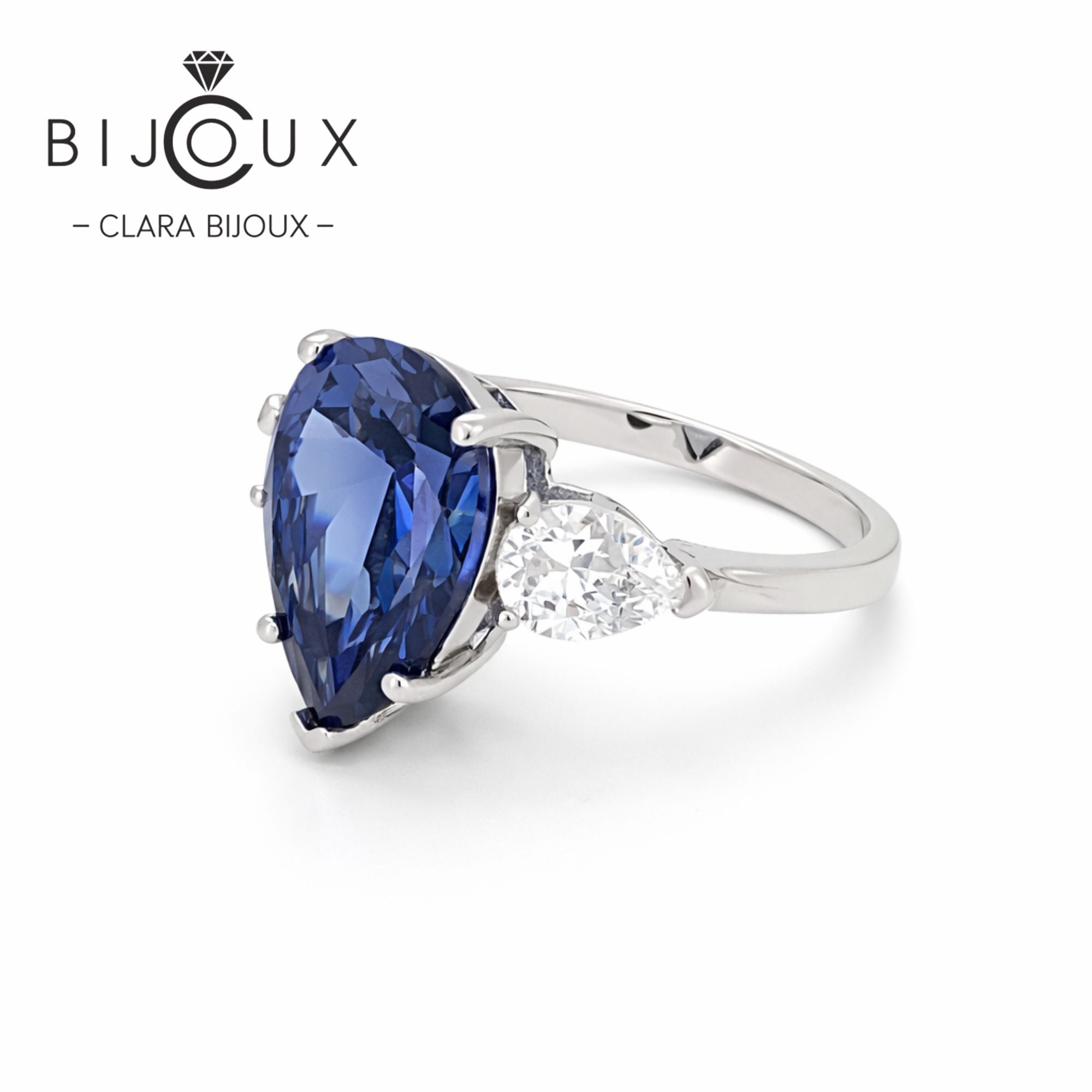 Луксозен сребърен пръстен с тъмносин CZ Clara Bijoux е модел с подчертан характер и изискано излъчване. Централният камък е голям тъмносин CZ с издължена капковидна форма, фасетиран така, че създава дълбочина и наситен блясък при всяко движение на ръката. От двете му страни са поставени бели CZ камъни, които осигуряват светлинен контраст и подчертават драматичната красота на синия акцент.