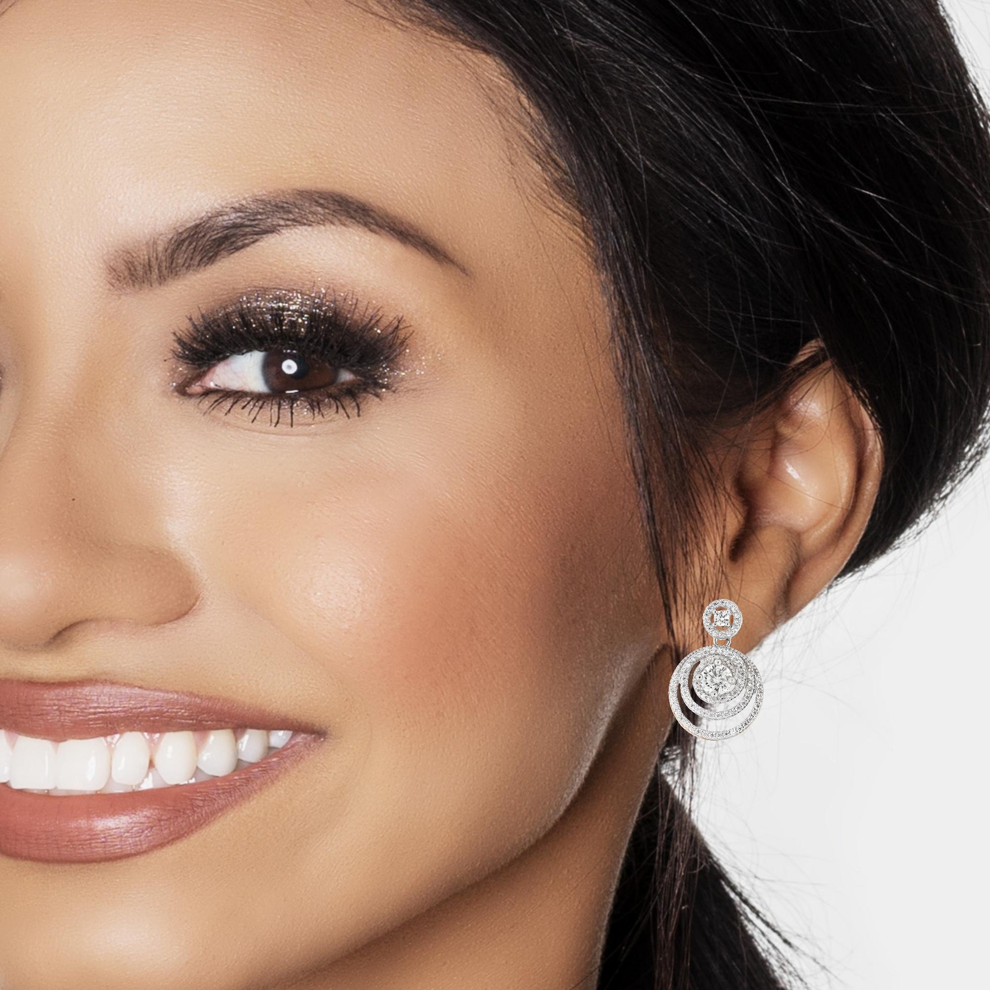 Тези висящи луксозни обеци Clara Bijoux са символ на женственост и изтънчен вкус. Изработени от висококачествено сребро проба 925 с родиево покритие, те се отличават с блясък и устойчивост. Централните мойсанити (по 0.5ct, общо 1ct) са заобиколени от кръгове с фин ореол от миниатюрни камъни – композиция, която създава ефект на движение и светлина.