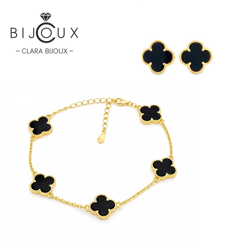 Изящен позлатен комплект Clara Bijoux, изработен от сребро 925 с естествен черен ахат във формата на детелинка. Включва гривна и обеци, луксозно опаковани в кутия с LED светлина и подаръчна торбичка.