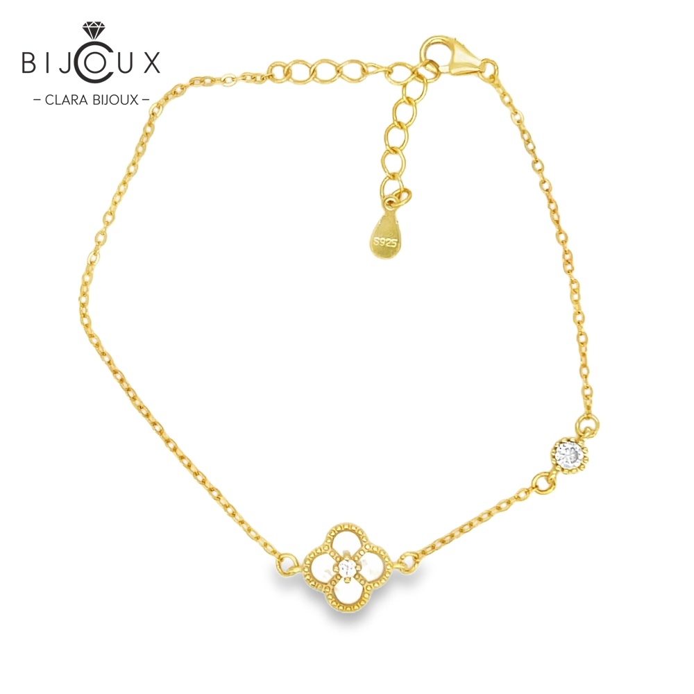 Фина гривна от сребро 925 с жълта позлатка, украсена с елегантна детелинка от бял седеф и блестящ бял камък CZ. Модел с изключително женствено излъчване, вдъхновен от френски дизайнер, носещ послание за късмет и елегантност.