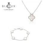 Този изящен комплект от колие и гривна, изработен от фино родирано сребро се отличава с деликатна верижка и красиво изработени висулки от Бял Седеф във формата на детелини. Сложните детайли около краищата добавят нотка изтънченост, което ги прави идеални, както за ежедневно носене, така и за специални поводи. Верижката е включена в цената. Всички бижута са придружени от специален сертификат, удостоверяващ автентичността им. На този сертификат можем да изпишем и лично послание за Вас или за когото е бижуто. Всяка поръчка пристига при Вас луксозно опакована, в брандирана кутийка и торбичка, готова за поднасяне като подарък.