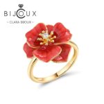 Бутиков сребърен пръстен с червено цвете, изработен с жълта позлатка и емайл. Елегантен модел с бели камъни, съчетаващ стил и лукс – топ качество на топ цена.