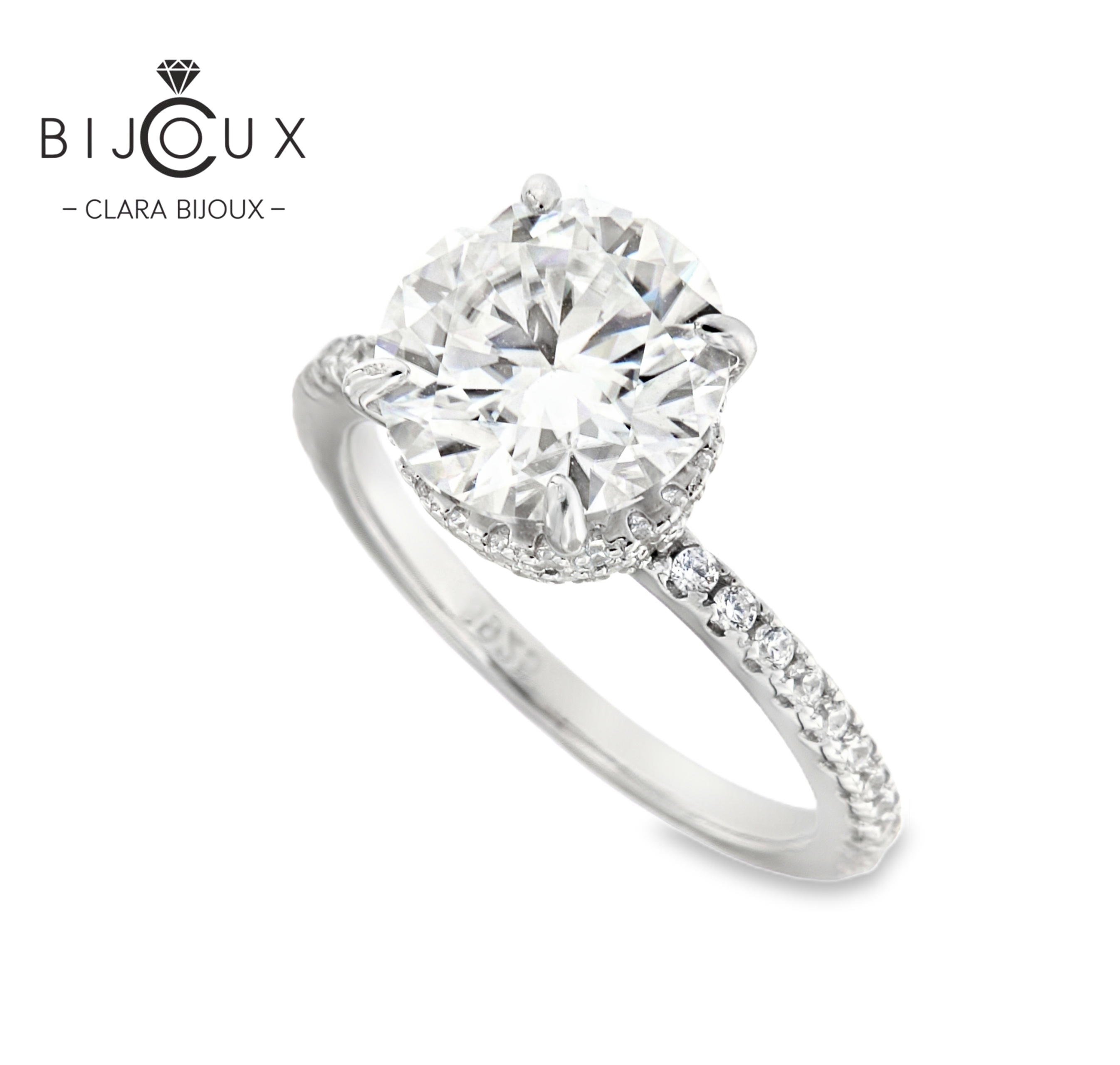 Сребърен годежен пръстен с 1.0ct кръгъл мойсанит и фини инкрустации по халката, представен с елегантна визия; модел от Clara Bijoux с луксозна брандирана опаковка.