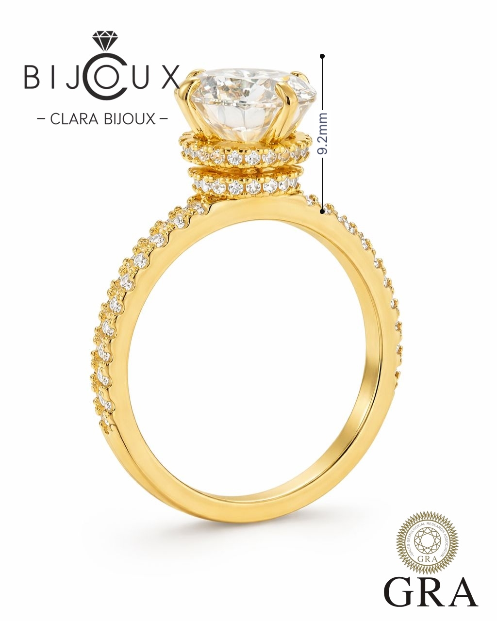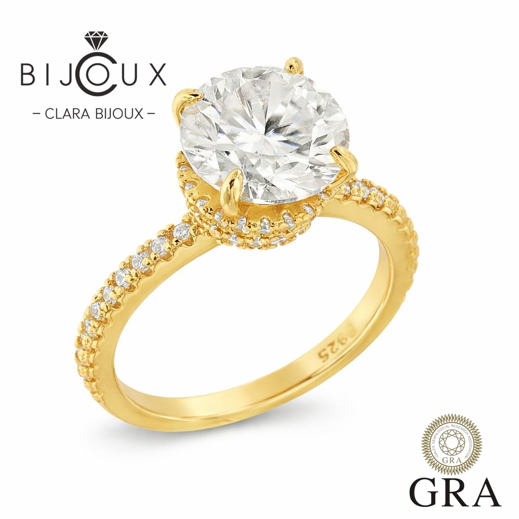Позлатен сребърен пръстен 925 с впечатляващ мойсанит 3ct в цвят D и чистота VVS1. Елегантен, бляскав и подходящ за специален подарък. Включена луксозна LED кутия и подаръчна торбичка.