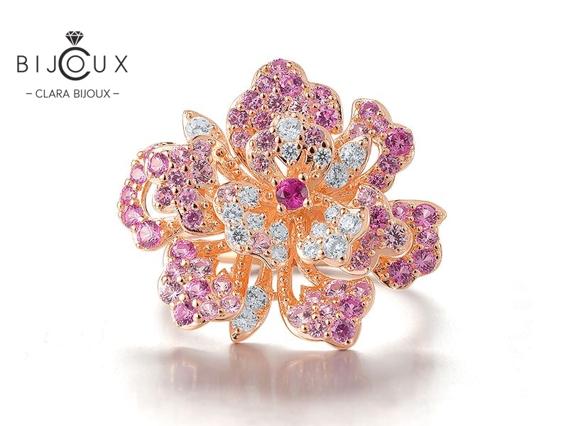 Пръстенът е украсен с лабораторни розови сапфири – символ на любов и страст, синтетични рубини, които носят енергия и жизненост, и бели CZ камъни, добавящи сияен акцент. Всяко детайлно изработено листенце е истинско бижутерско изкуство, подчертаващо нежния характер на дамата, която го носи.