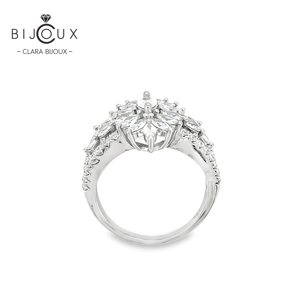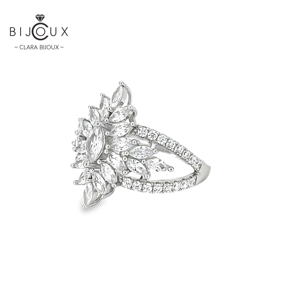 Изработен от родирано сребро 925, пръстенът е изцяло обсипан с камъни в марquise и кръгла шлифовка, разположени в хармонична композиция, напомняща ледена цветна корона.