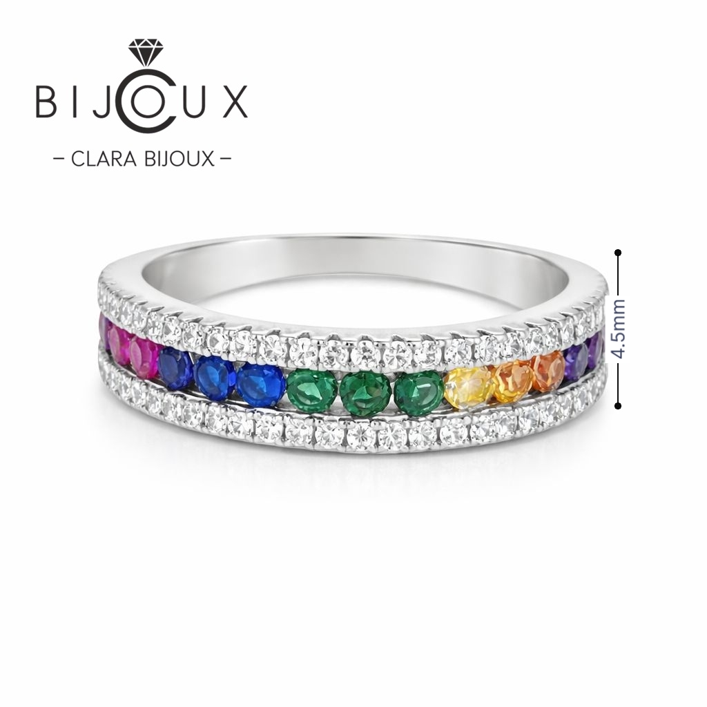 Изработен е от висококачествено родирано сребро 925, което придава изключителен блясък и защитава метала от потъмняване. Централната линия е обсипана с малки фасетирани камъни в богата гама от нюанси – зелено, лилаво, синьо, розово, жълто и шампанско. Двете странични редици от бели камъни добавят дълбочина и изискан контраст.
