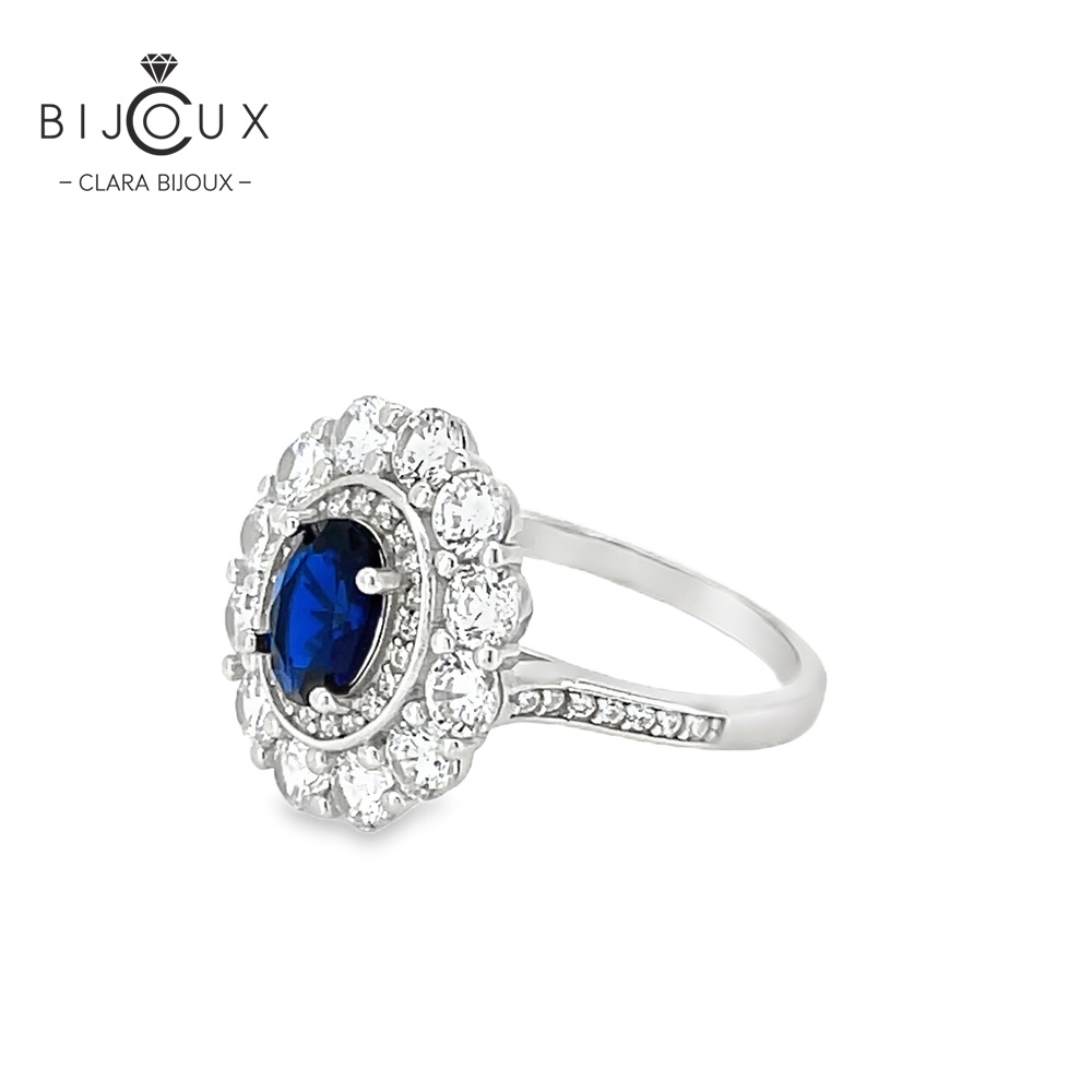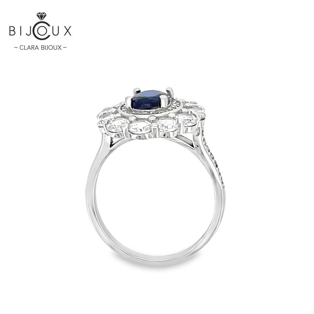 Бутиков пръстен от родирано сребро 925 с централен тъмносин камък CZ, обграден от малки бели камъни. Изключително луксозен модел, поднесен в брандирана LED кутия и подаръчна торбичка Clara Bijoux.