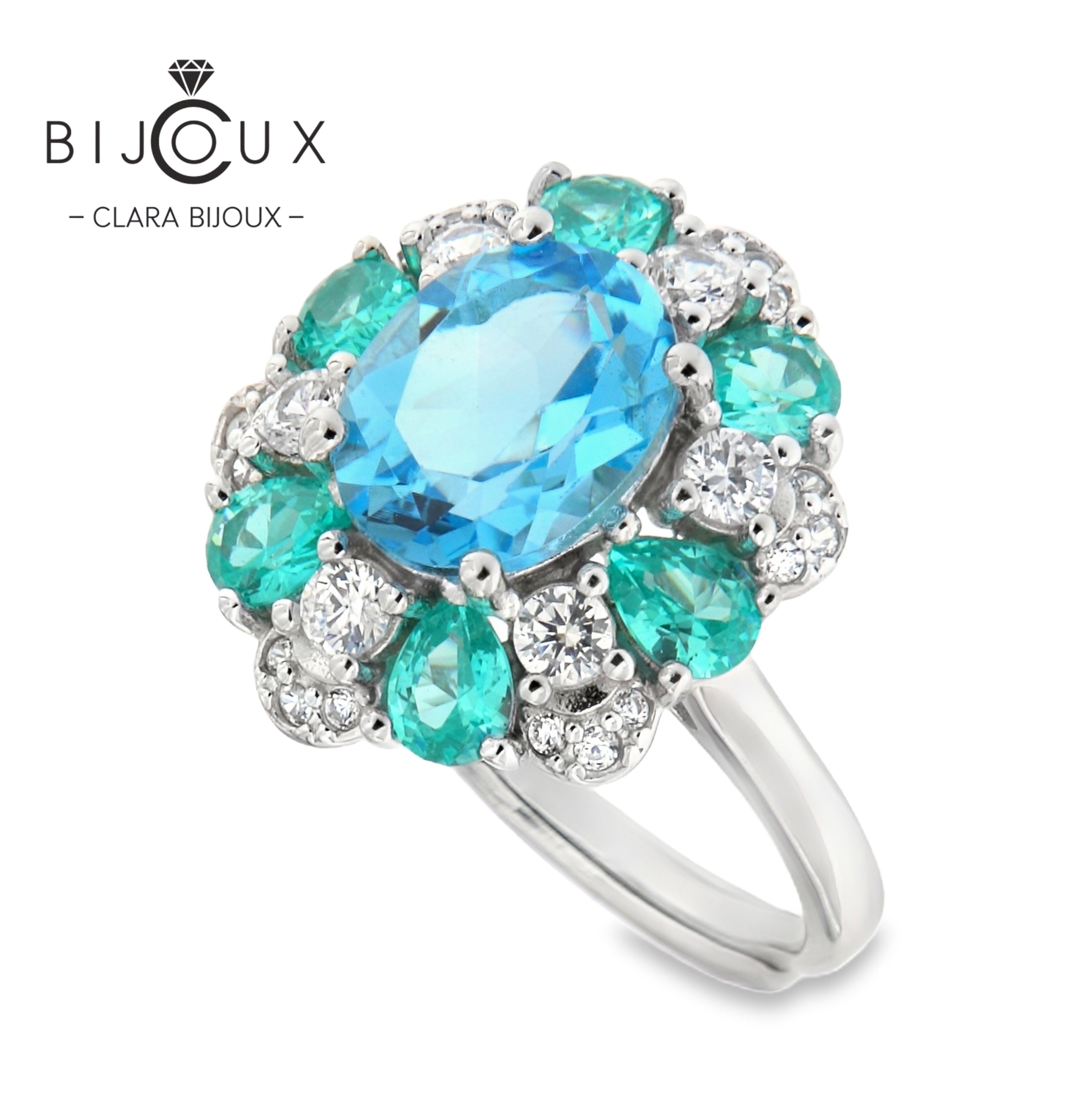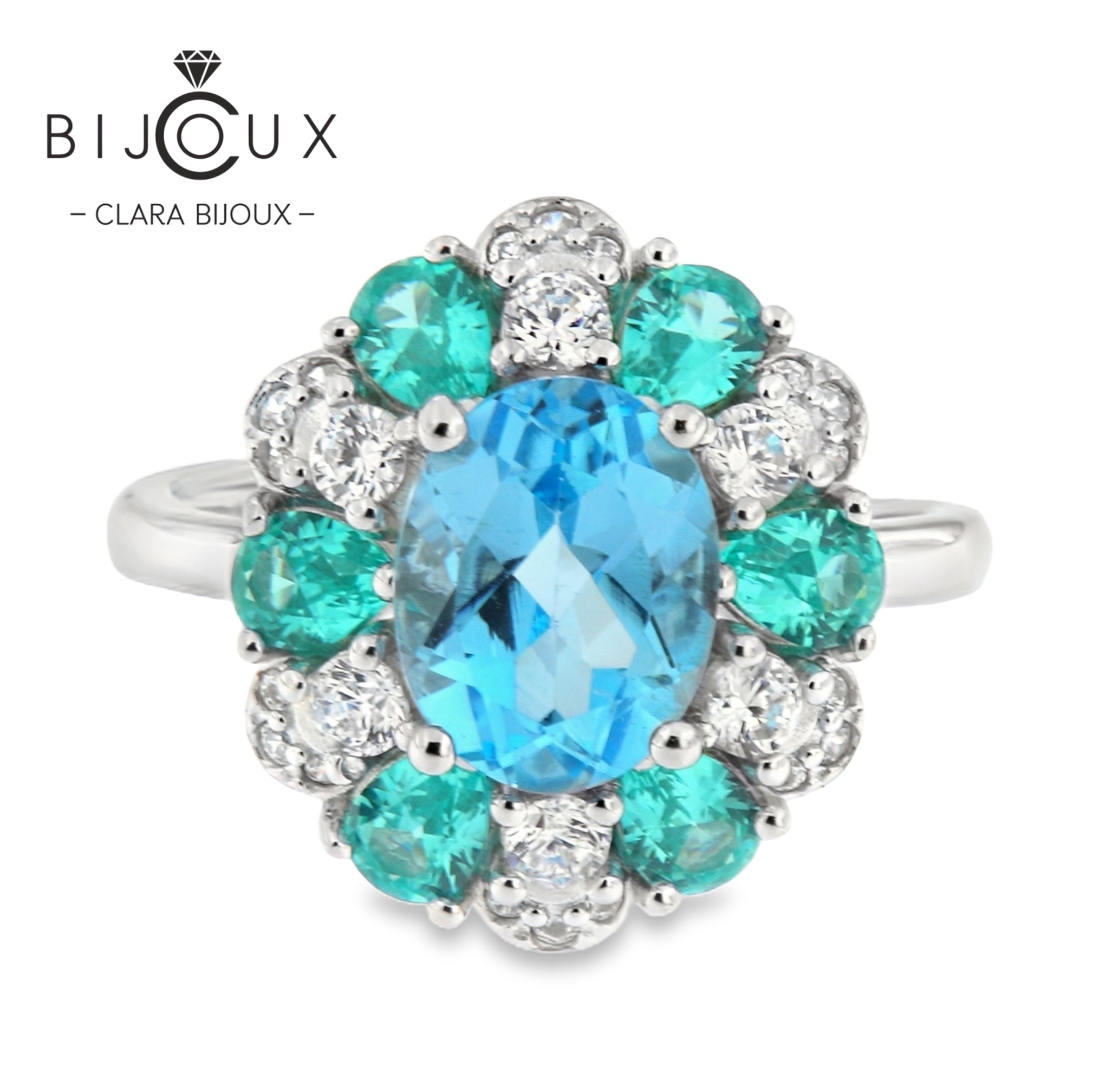 Този бутиков сребърен пръстен със Swiss Blue Topaz Clara Bijoux е въплъщение на класа, блясък и женственост. Изработен от сребро 925 с родиево покритие, той впечатлява с яркия си централен естествен Swiss Blue Topaz 2.2ct, обграден от феерия от бели CZ камъни и тюркоазени акценти, напомнящи морска вълна. Всеки детайл е създаден с прецизност, за да подчертае лукса и съвършената изработка.