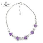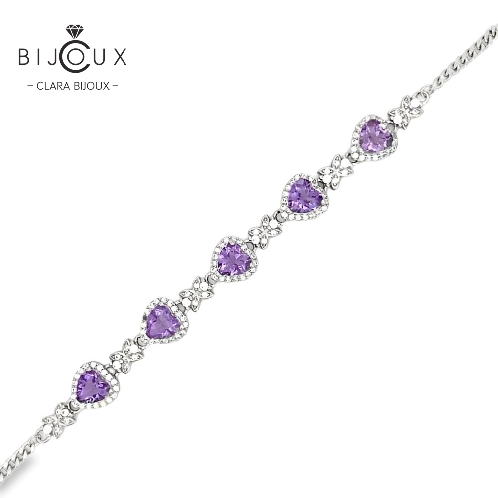 Тази сребърна гривна с аметист Clara Bijoux е създадена като израз на женствена елегантност и неподвластен на времето стил. Сърцевидно шлифованите естествени аметисти са подредени в хармонична линия, която придава ритъм и визуален баланс на бижуто. Всеки камък е обграден от деликатни бели CZ, които усилват блясъка и подчертават дълбокия виолетов цвят.