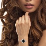 Изискана гривна от родирано сребро 925, украсена с детелинка от черен ахат и обградена с фини бели CZ камъни. Модел с елегантен френски дизайн, съчетаващ класическа естетика и модерен акцент.