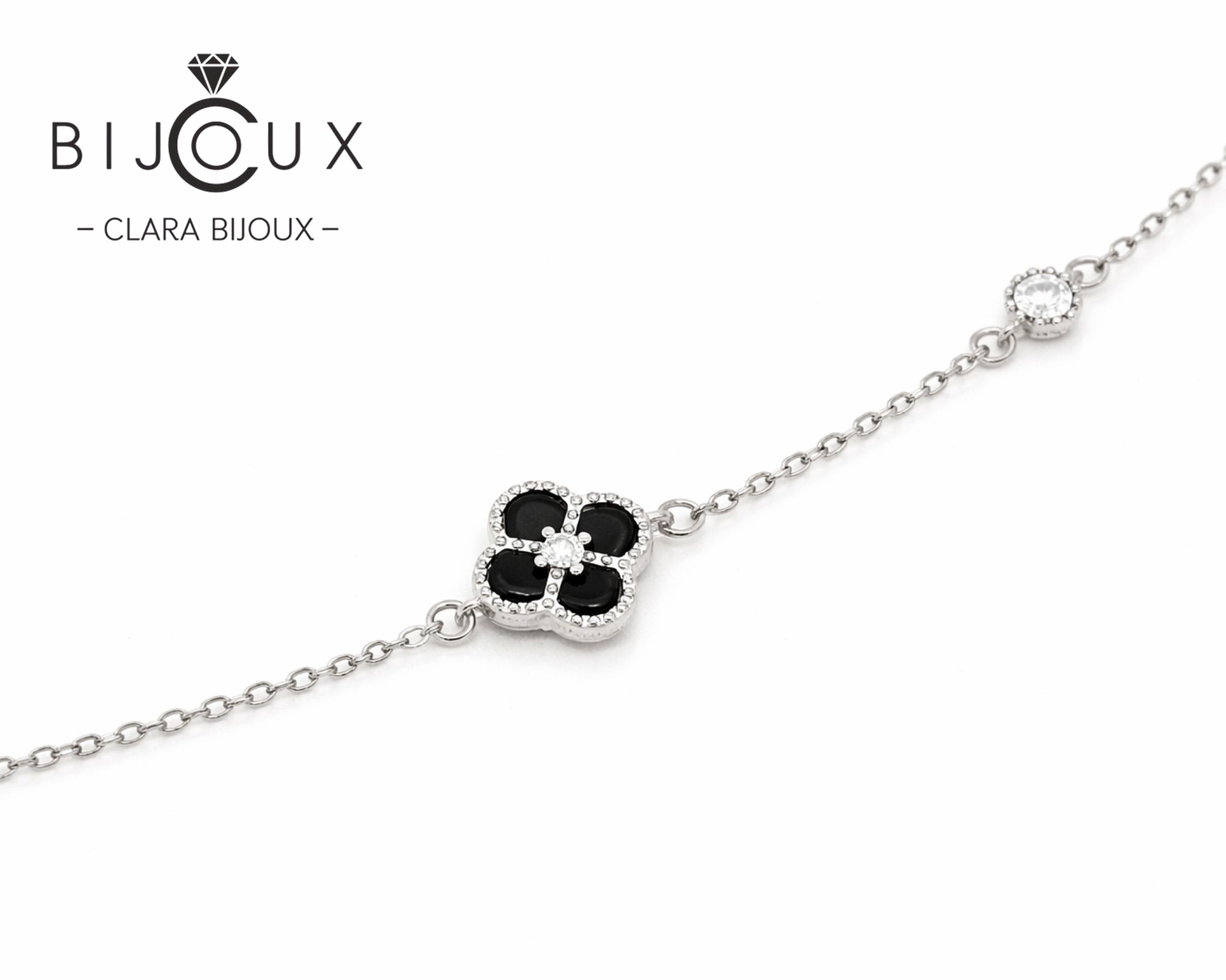 Луксозна гривна от родирано сребро 925 с изящна детелинка от черен ахат и бял CZ камък. Силна и стилна визия, вдъхновена от френски дизайн. Дължина 16 + 3 см, луксозна подаръчна опаковка с LED светлина.