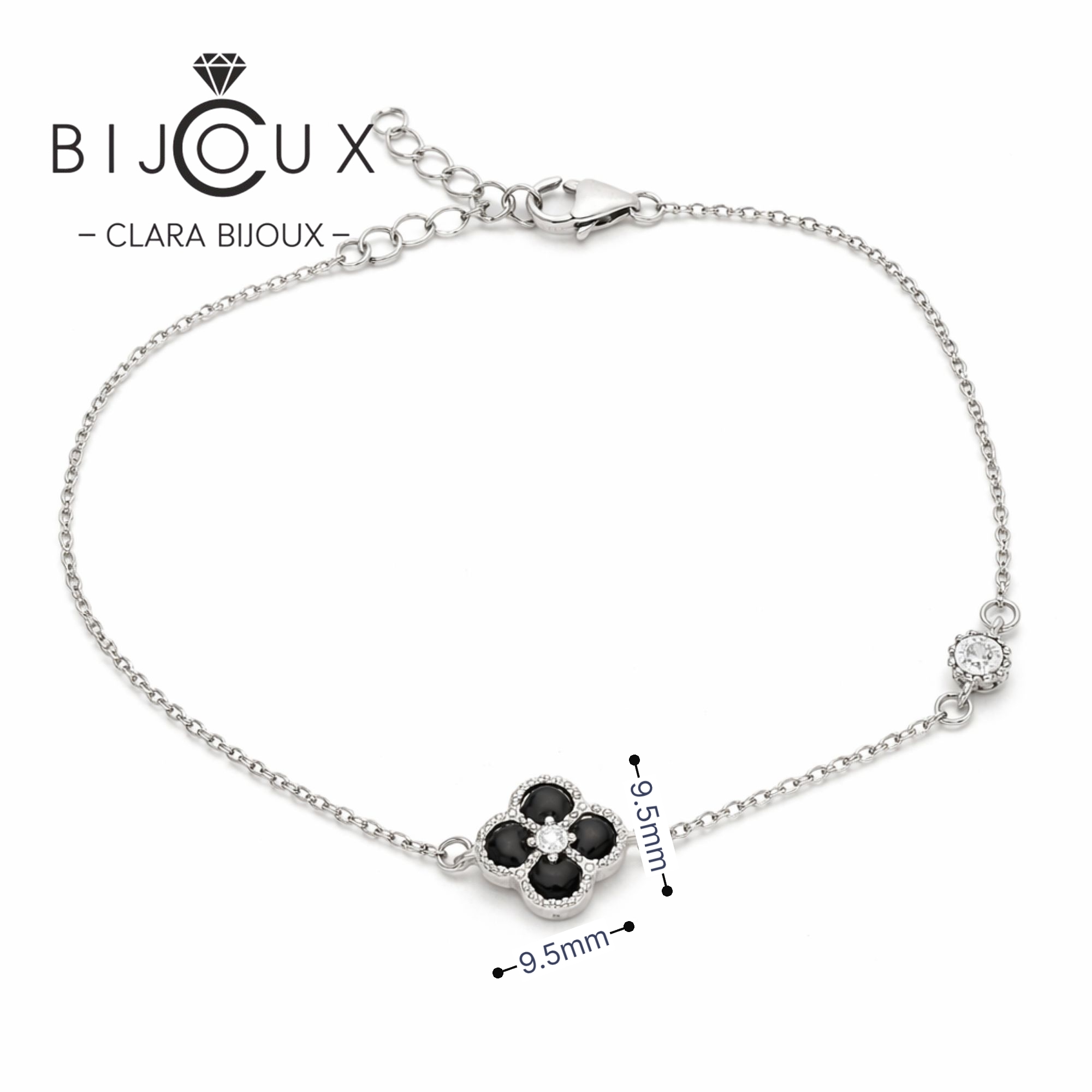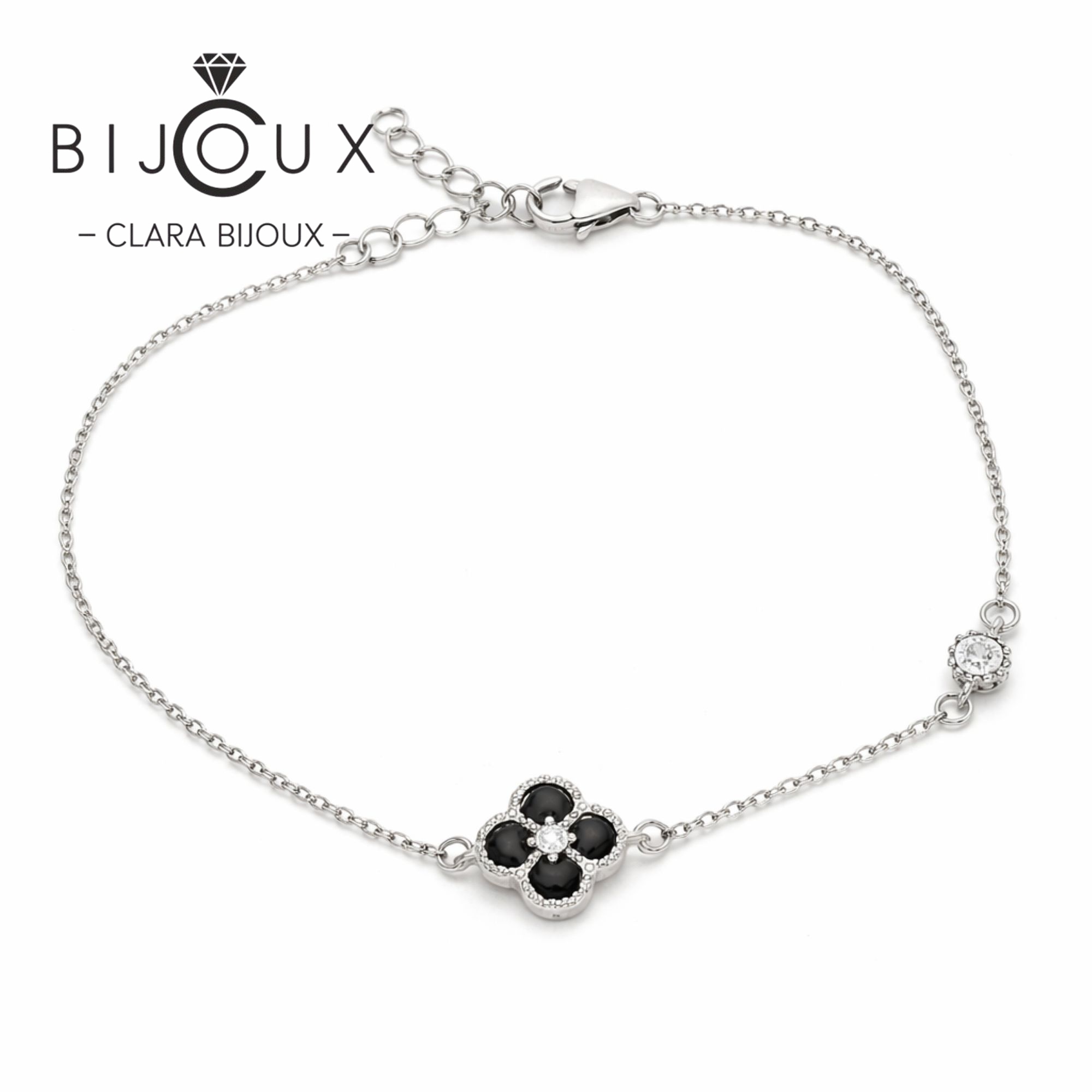 Начало Бижута Сребърни бижута Гривни Сребърна гривна с детелинка от черен ахат и CZ – Clara Bijoux