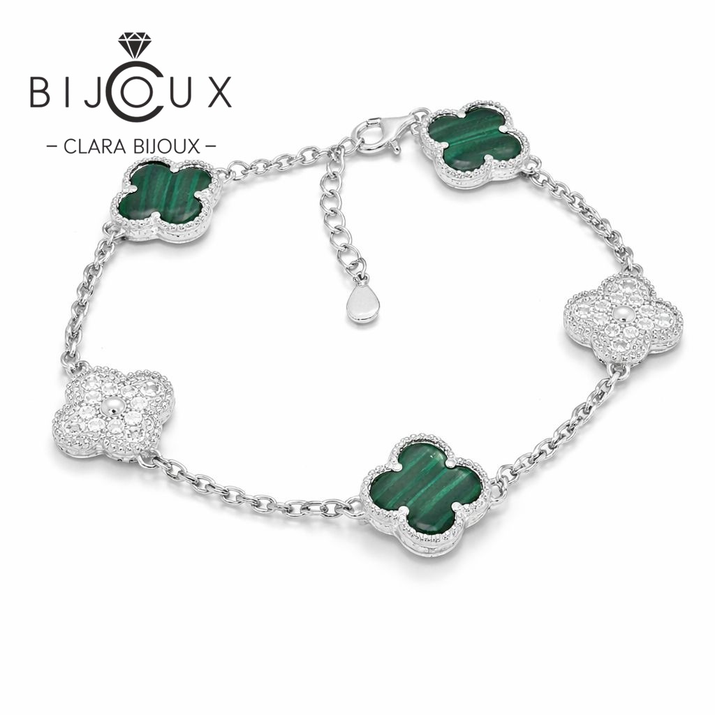 Тази изящна гривна, изработена от фино родирано сребро се отличава с хармонична комбинация от сребърни и наситено зелени елементи, създавайки изискан аксесоар подходящ за всеки повод. Моделът, който е вдъхновен от стила на известен френски дизайнер включва редуващи се мотиви във формата на детелина с наситени зелени акценти и бляскави Циркони, добавяйки нотка елегантност към вашата китка. Всички бижута са придружени от специален сертификат, удостоверяващ автентичността им. Всяка поръчка пристига при Вас луксозно опакована, в брандирана кутийка и торбичка, готова за поднасяне като подарък.