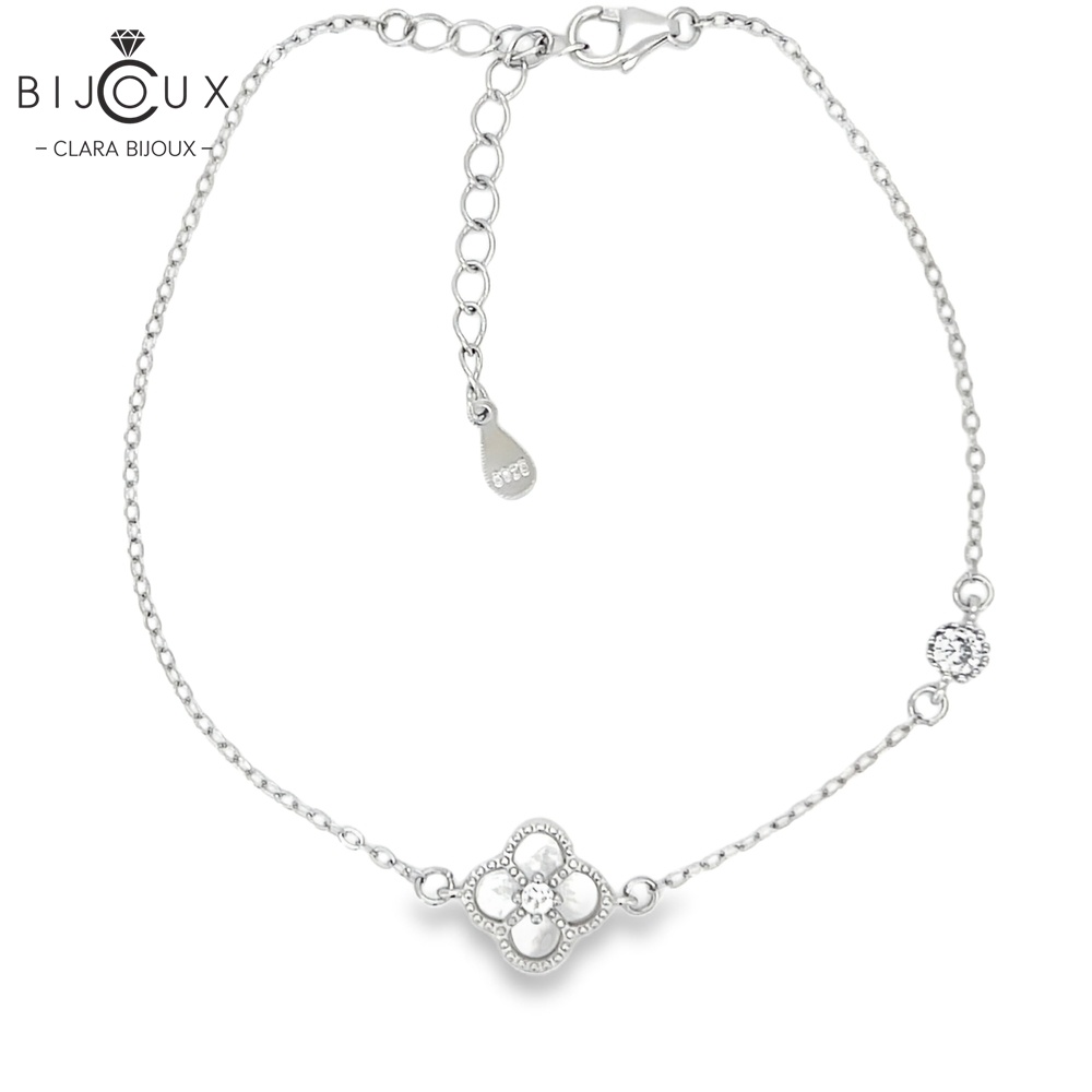 Тази изключителна гривна от родирано сребро 925 съчетава деликатен дизайн и символично послание, превръщайки се в не просто бижу, а в изискан амулет за късмет и стил. Централният елемент – детелинка от естествен бял седеф – носи усещане за чистота, хармония и благополучие. Нейният блясък се допълва от изящен бял CZ камък, който придава фино сияние и подчертава луксозния характер на модела.