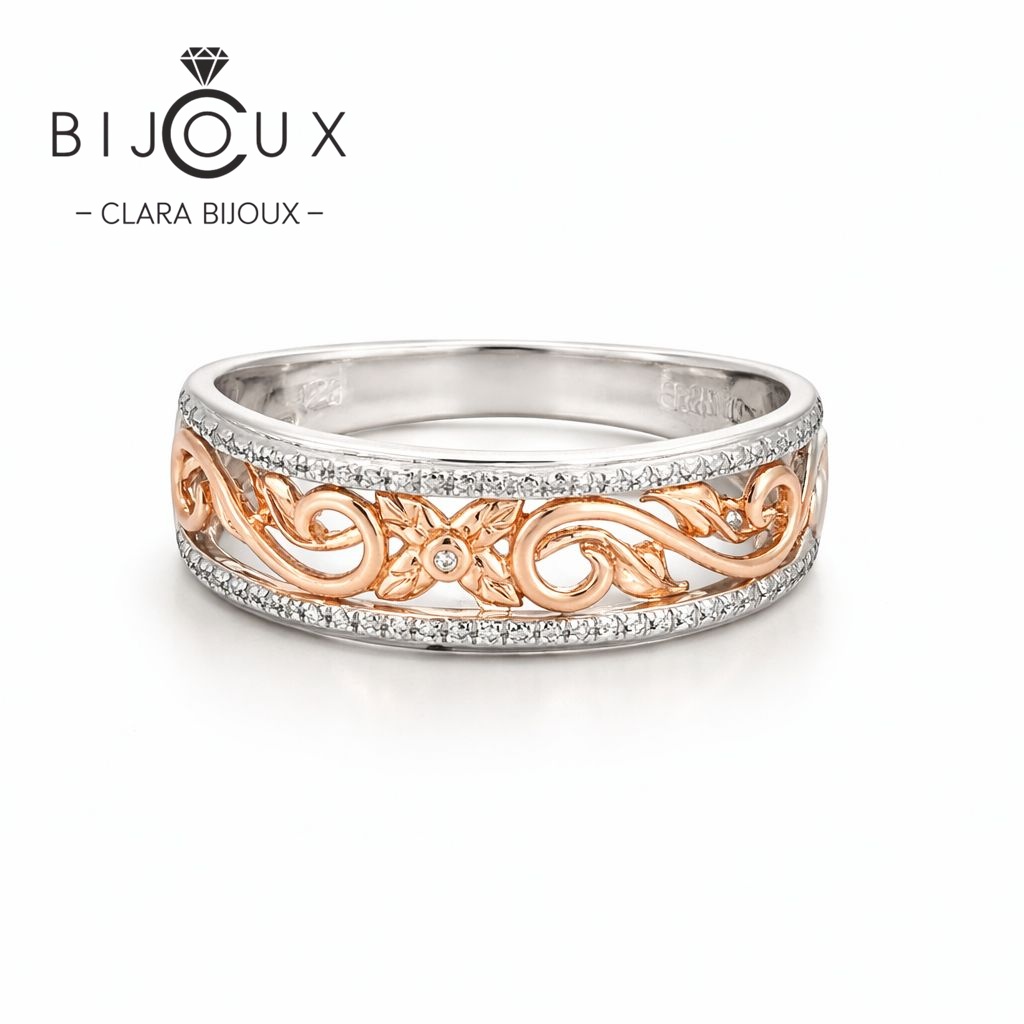Централният орнамент с розовозлатист акцент създава стилен контраст и подчертава уникалния дизайн на тази сребърна халка CZ. Комбинацията от класическо сребро, родиево покритие и елегантни детайли прави бижуто подходящо както за ежедневно носене, така и за специални поводи. Дизайнът символизира хармония, баланс и вечност, което превръща халката в прекрасно лично бижу или стилен подарък.