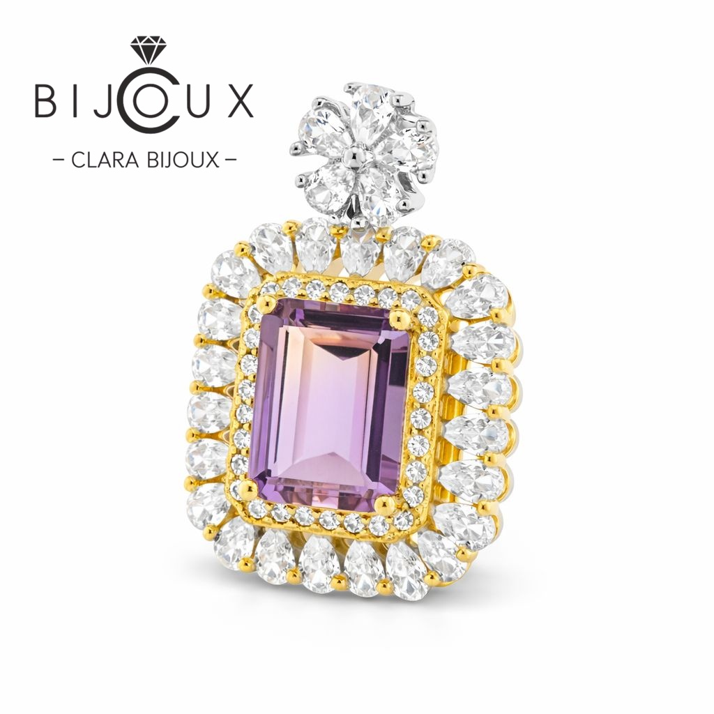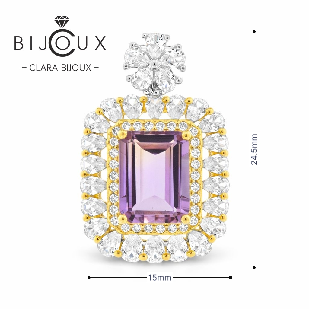 Тази сребърна висулка с аметрин Clara Bijoux е едно от най-впечатляващите бижута в колекцията – изящно съчетание между естествена красота и съвременен дизайн. Изработена от сребро проба 925 с родиево покритие, тя впечатлява с уникалния си централен камък – естествен аметрин 4 карата, известен със своите преливащи се нюанси между виолетово и златисто. Заобиколена от нежни бели CZ, висулката излъчва лукс, стил и хармония.