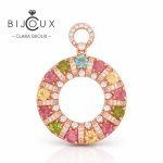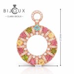Кръглата форма символизира вечност, баланс и съвършенство. Комбинацията от многоцветни турмалини и фино разположени бели камъни създава динамика, блясък и изискан стил. Полираната повърхност усилва отражението на светлината и подчертава детайлната изработка.