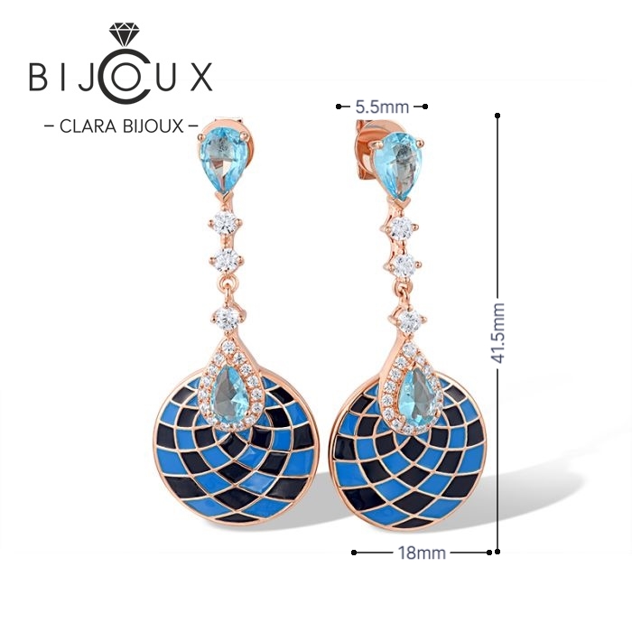 Ефектни дамски обеци, които няма как да останат незабелязани. Моделът е изработен от фино родирано сребро с розова позлатка и емайл, в комбинация с бляскави Сини Кристали и Бели Циркони. Всички бижута са придружени от специален сертификат, удостоверяващ автентичността им. Всяка поръчка пристига при Вас луксозно опакована, в брандирана кутийка и торбичка, готова за поднасяне като подарък.