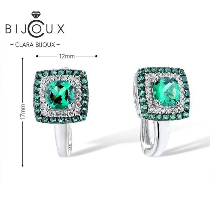 Очарователни дамски обеци, изработени от фино родирано сребро. Зелен Шпинел в квадратна форма е акцентът в бижуто, заобиколен от нежни бляскави Циркони. Всички бижута са придружени от специален сертификат, удостоверяващ автентичността им. Всяка поръчка пристига при Вас луксозно опакована, в брандирана кутийка и торбичка, готова за поднасяне като подарък.