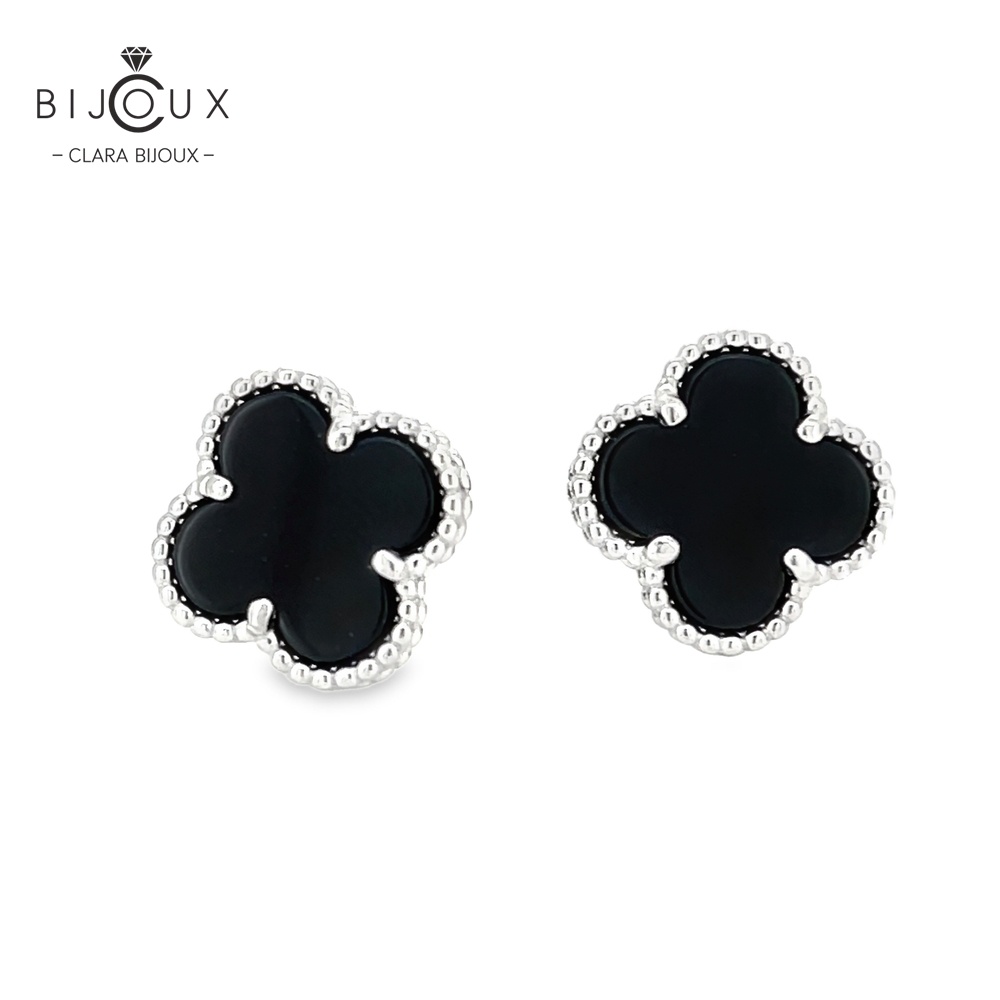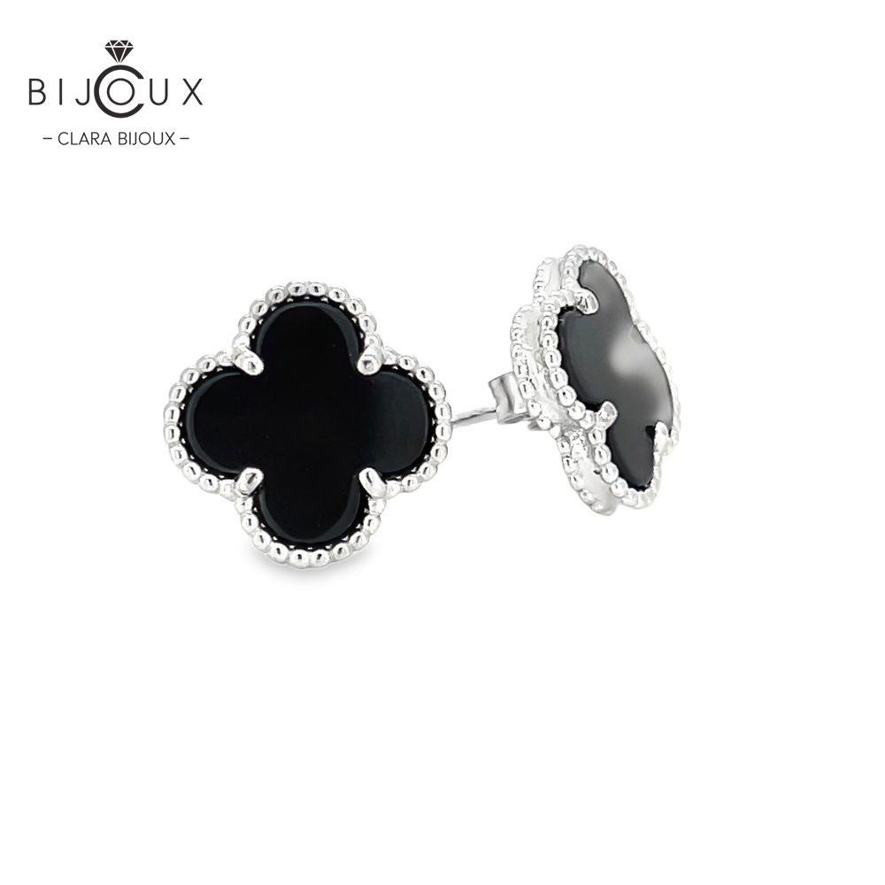 Елегантни сребърни обеци с черен ахат Clara Bijoux, изработени от родирано сребро 925. Символ на сила и увереност, този модел с четирилистни детелинки е вдъхновен от френски дизайнер и се предлага в луксозна кутия с LED светлина.
