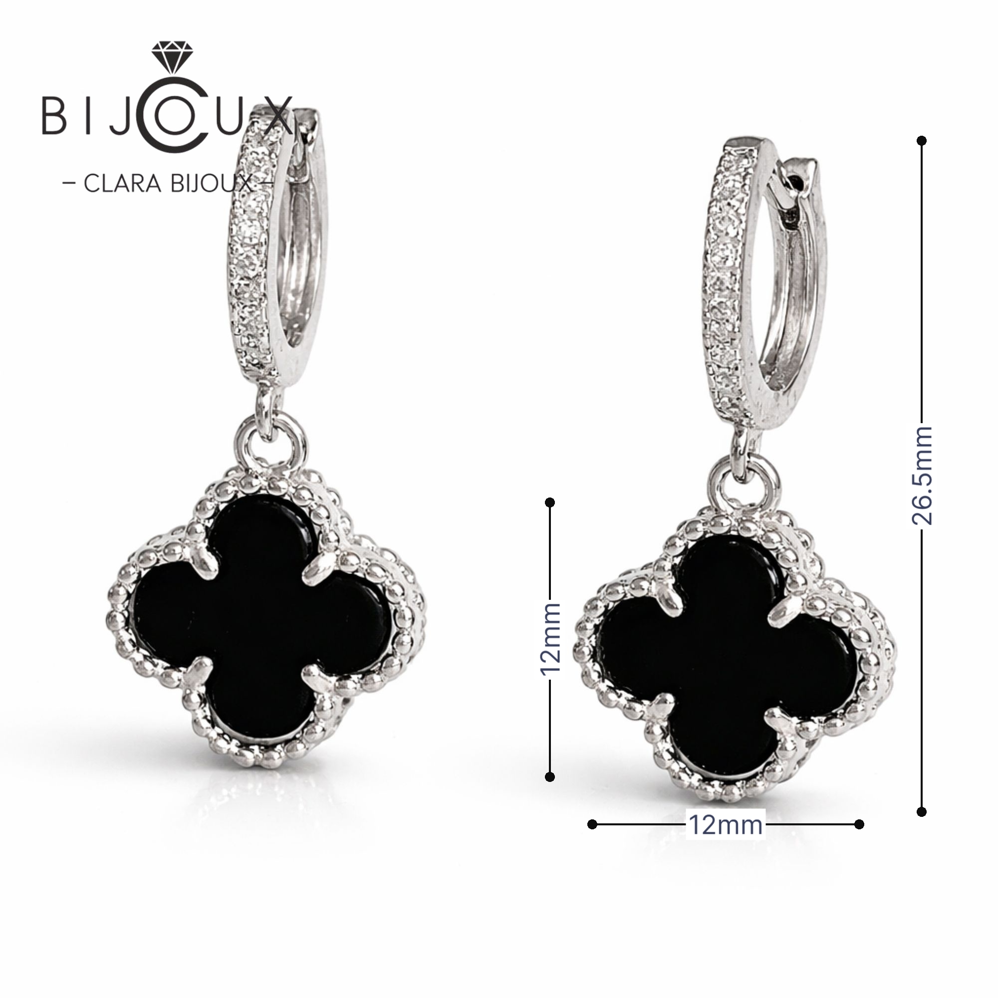 Моделът е част от селекция бутикови бижута, подбрани за клиенти, които търсят баланс между елегантност и характер. Формата детелина носи символика на късмет и хармония, а черният ахат добавя дълбочина и стил. Обеците са подходящи както за ежедневни визии, така и за по-официални поводи.