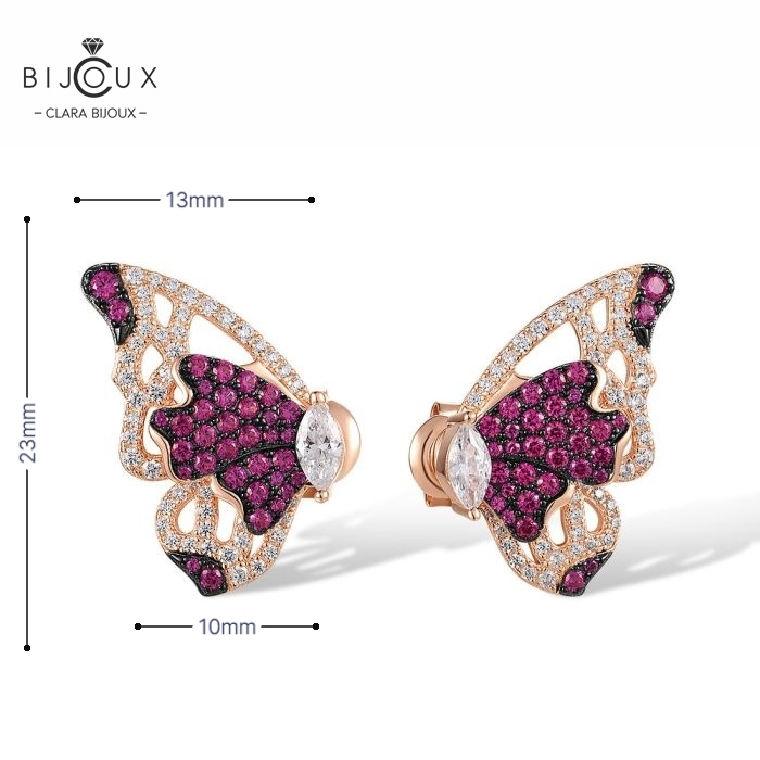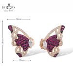 Уникални дамски обеци, изработени от фино родирано сребро с розова позлатка във формата на Пеперуди, обсипани с лабораторни Рубини и Бели бляскави Циркони, с които няма как да останете незабелязани. Всички бижута са придружени от специален сертификат, удостоверяващ автентичността им. Всяка поръчка пристига при Вас луксозно опакована, в брандирана кутийка и торбичка, готова за поднасяне като подарък.