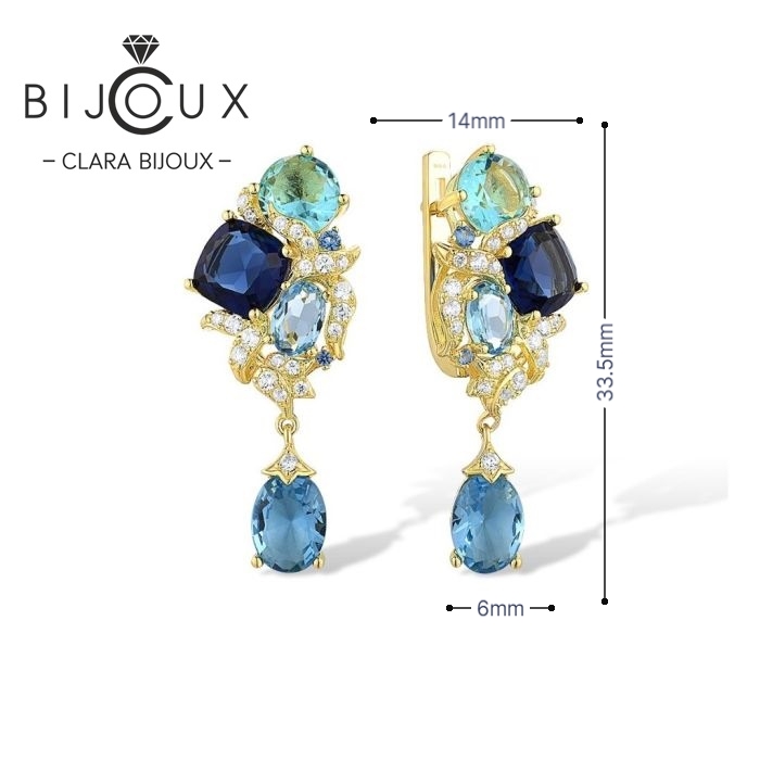 Очарователни дамски обеци, изработени от фино родирано сребро с жълта позлатка, обсипани със Сини Кристали, Сини Шпинели и Бляскави Бели Циркони. Всички бижута са придружени от специален сертификат, удостоверяващ автентичността им. На този сертификат можем да изпишем и лично послание за Вас или за когото е бижуто. Всяка поръчка пристига при Вас луксозно опакована, в брандирана кутийка и торбичка, готова за поднасяне като подарък.