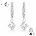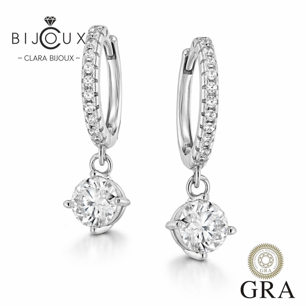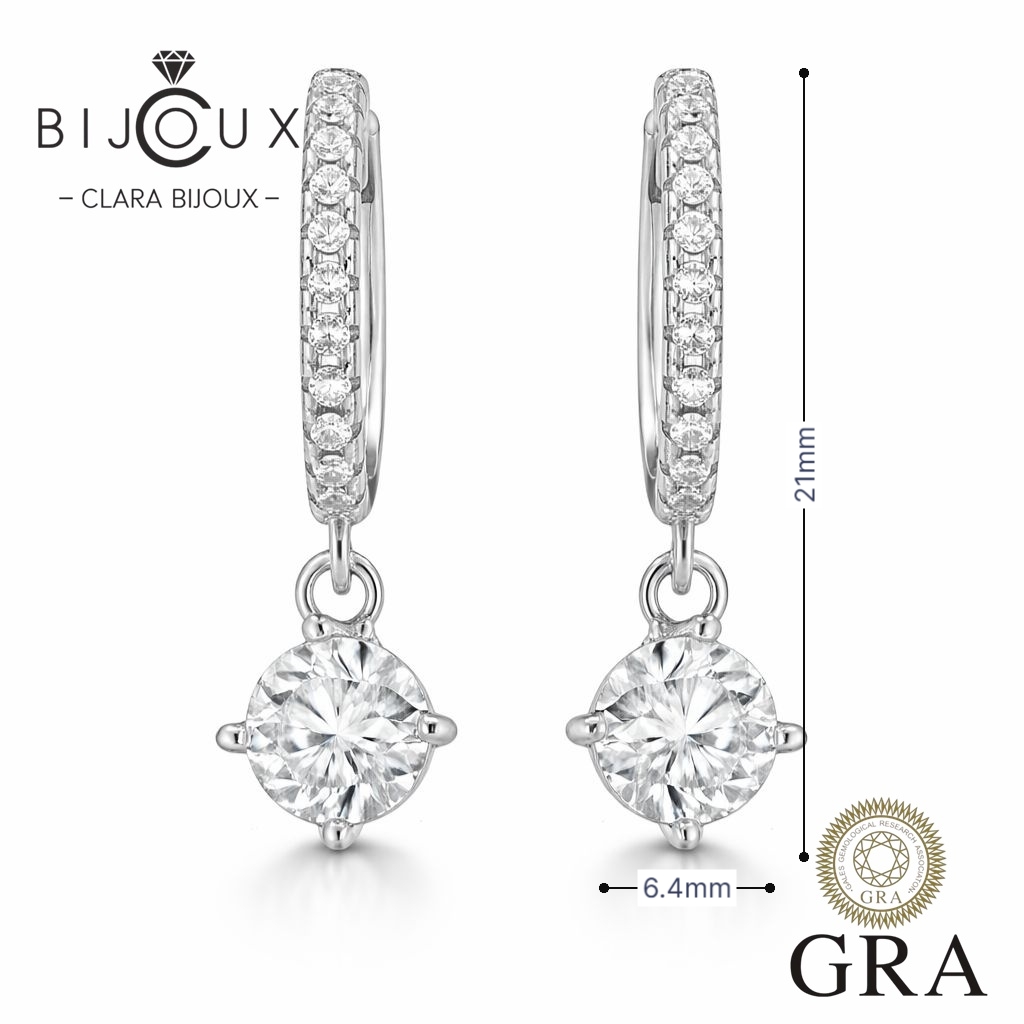 🔹 Централните камъни са два мойсанита по 0.5ct – с общ карат 1.0ct, инкрустирани в семпли четирикракови обкови, които ги държат стабилно и видимо. Окачени са на халки с блестяща инкрустация, което придава допълнителен блясък, без да е натрапчиво.
