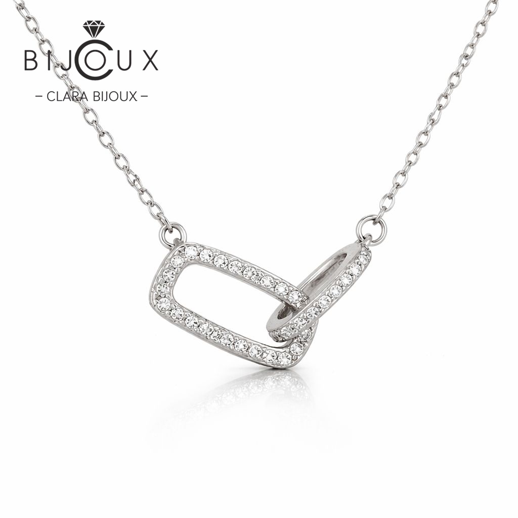 Това сребърно колие с бели CZ Clara Bijoux се отличава с модерен геометричен дизайн и изчистена естетика. Централният елемент представлява елегантна форма с фино инкрустирани бели CZ камъни, които придават деликатен, но отчетлив блясък. Моделът е създаден да бъде стилен акцент, без да доминира, като подчертава индивидуалността и добрия вкус.