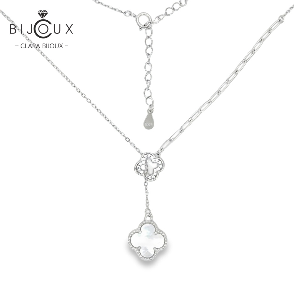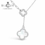 Това изключително сребърно колие с бял седеф Clara Bijoux е вдъхновено от френската мода и символиката на късмета и изяществото. Висящата детелинка от бял седеф нежно отразява светлината, напомняйки за чистота, баланс и ново начало. Горната детелинка е обсипана с блестящи бели CZ камъни, които добавят нотка лукс и съвършенство. Родираното сребро 925 гарантира дълготраен блясък и устойчивост.