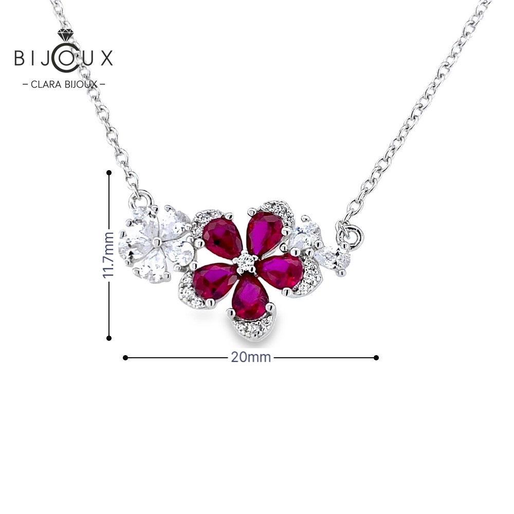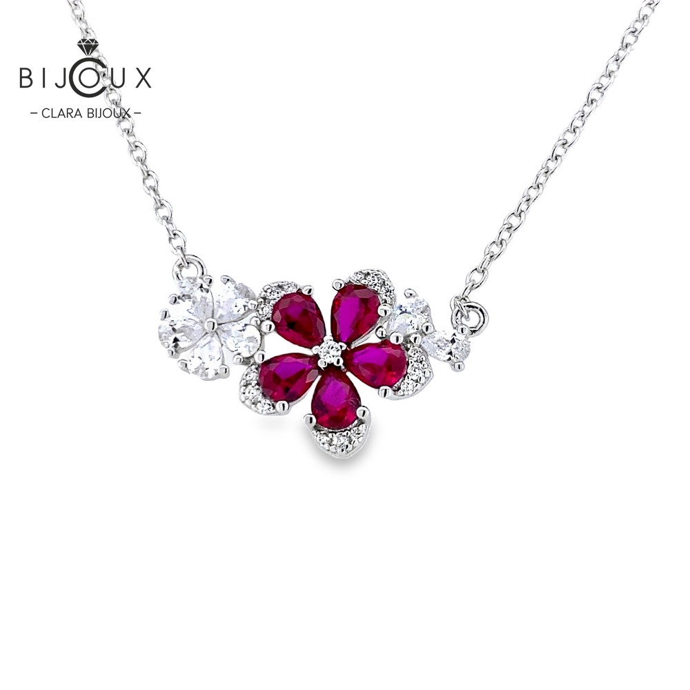 Изискано дамско колие изработено от фино родирано сребро отличаващо се със зашеметяващи лабораторни Рубини в средата, заобиколени от ореол от бляскави Бели Циркони оформящи цвете. Елегантният дизайн и изящната изработка го правят идеален избор за тези, които търсят лукс и изтънченост. Верижката е включена в цената. Всички бижута са придружени от специален сертификат, удостоверяващ автентичността им. Всяка поръчка пристига при Вас луксозно опакована, в брандирана кутийка и торбичка, готова за поднасяне като подарък.