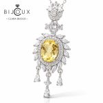 Това сребърно колие с цитрин е създадено като впечатляващ акцент за дами, които търсят луксозно излъчване и елегантен дизайн. Централният естествен цитрин се отличава със своя топъл златист оттенък, който придава сияние и жизненост на визията. Камъкът е прецизно инкрустиран и обграден от бели CZ камъни, които подсилват блясъка и подчертават формата на колието.