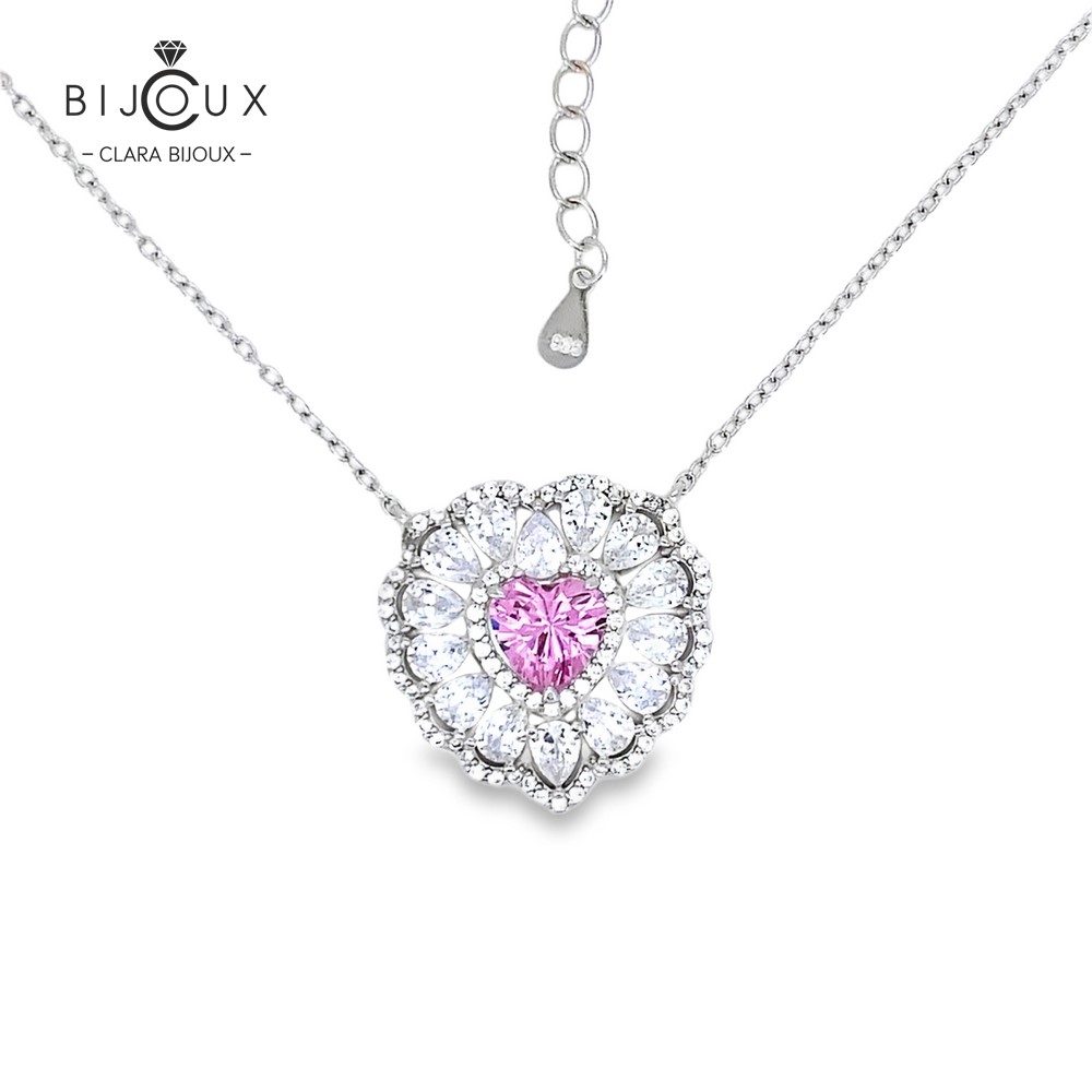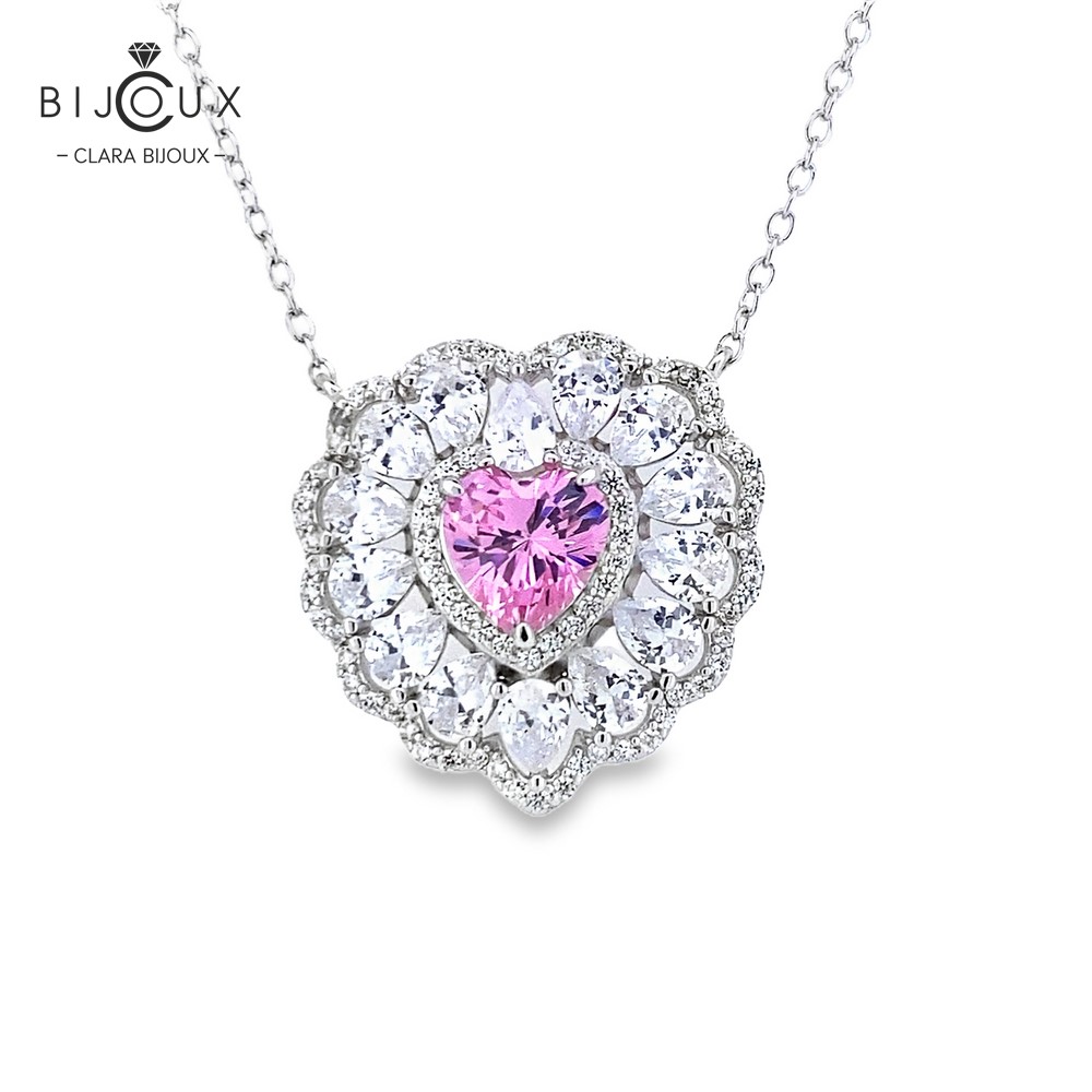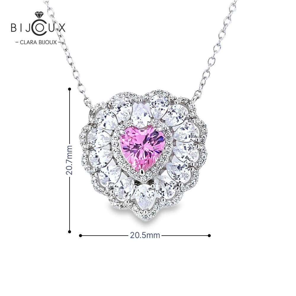 Това изящно колие изработено от родирано сребро с висулка във формата на сърце включва зашеметяващ Розов Циркон в центъра си, заобиколен от ореол от искрящи Бели Циркони. Деликатната сребърна верижка добавя елегантна нотка, което я прави перфектна както за ежедневно носене, така и за специални поводи. Верижката е включена в цената. Всички бижута са придружени от специален сертификат, удостоверяващ автентичността им. На този сертификат можем да изпишем и лично послание за Вас или за когото е бижуто. Всяка поръчка пристига при Вас луксозно опакована, в брандирана кутийка и торбичка, готова за поднасяне като подарък.